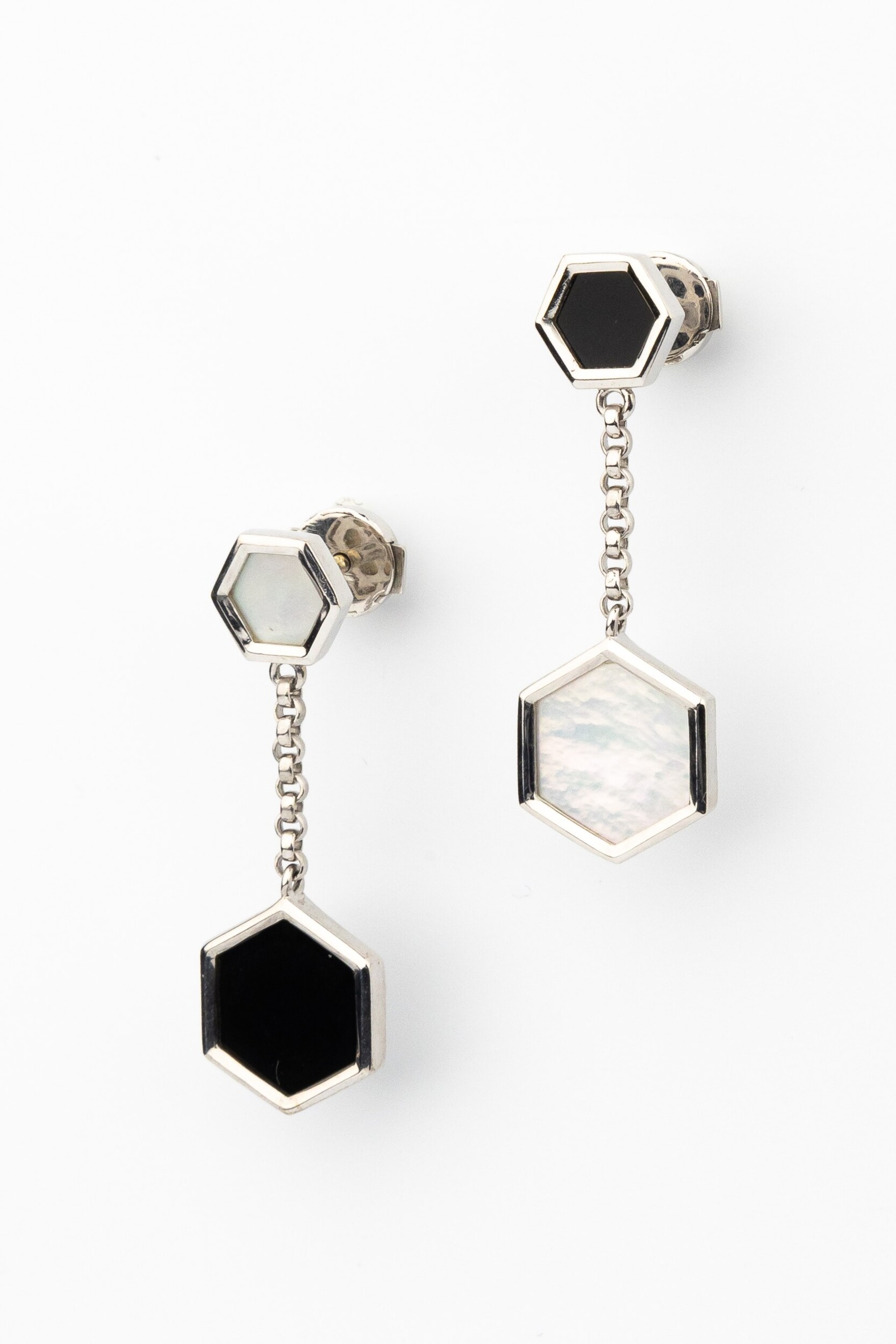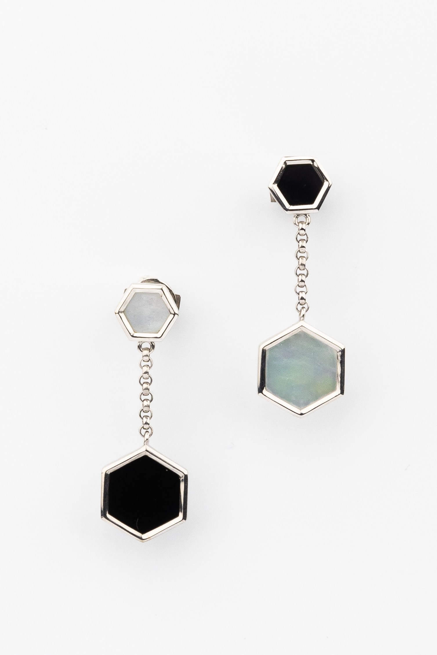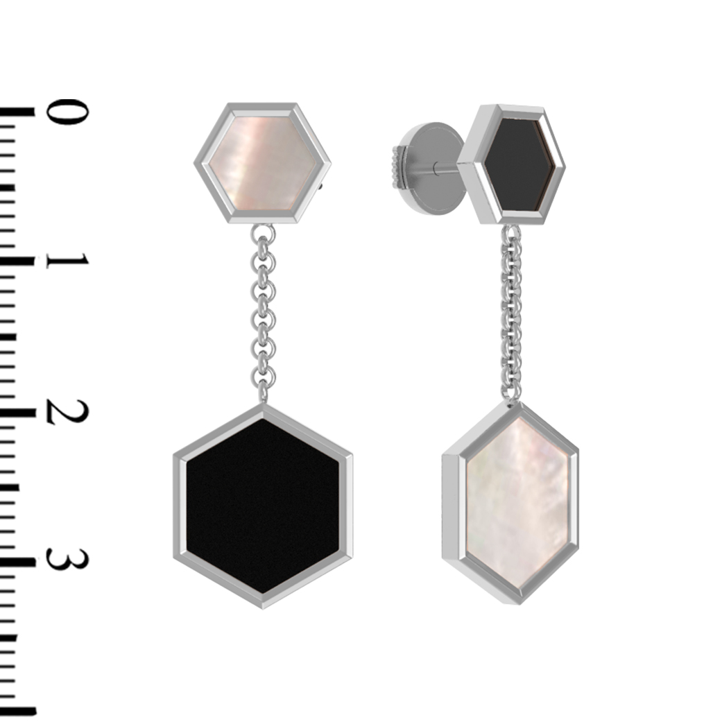 Центральным элементом композиции стали вставки в форме шестигранника. В каждом изделии гармонично переплетаются два противоположных материала: глубокий черный оникс и нежный перламутр. Такое сочетание цветов — перламутрового и черного — позволяет серьгам легко адаптироваться под любой образ, будь то деловой костюм или вечерний наряд. Всего в украшении использованы 2 вставки, образующие изящную подвесную конструкцию на цепочке, которая мягко играет при движении.