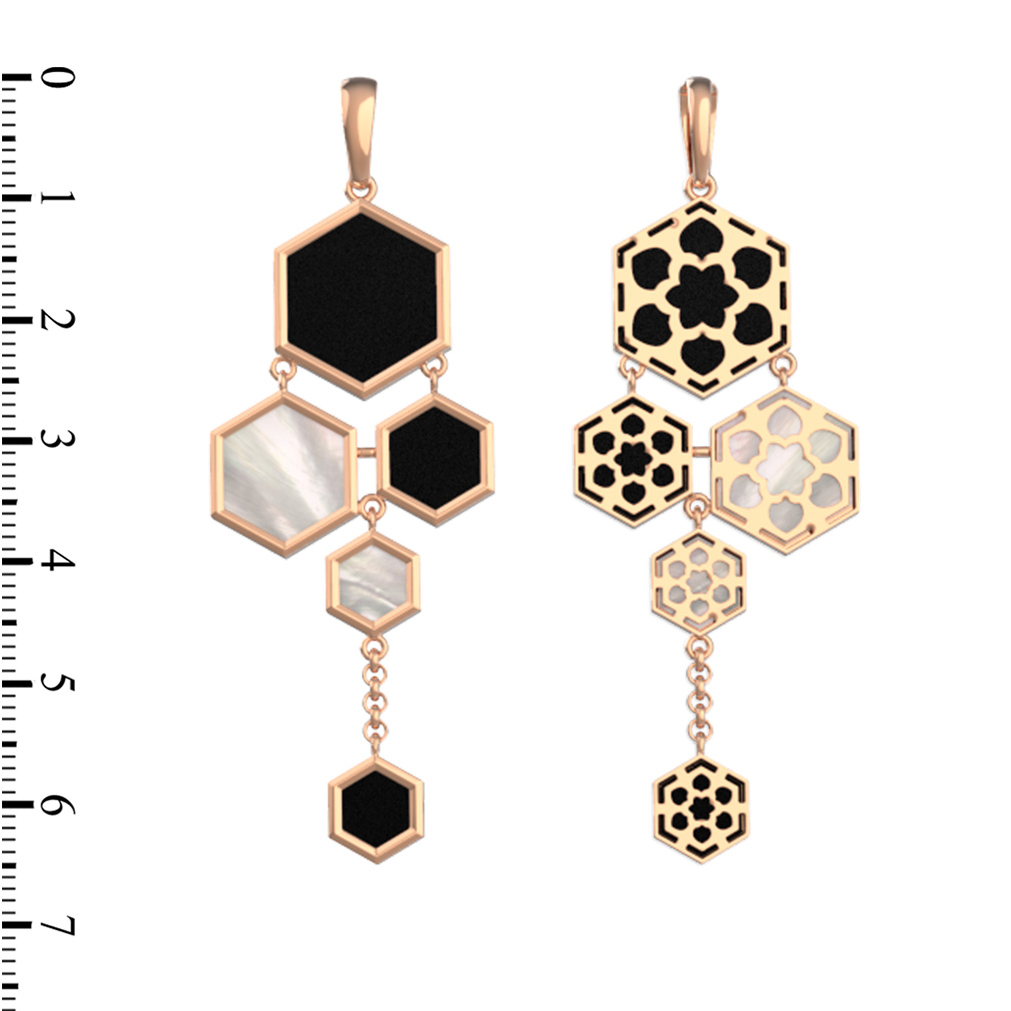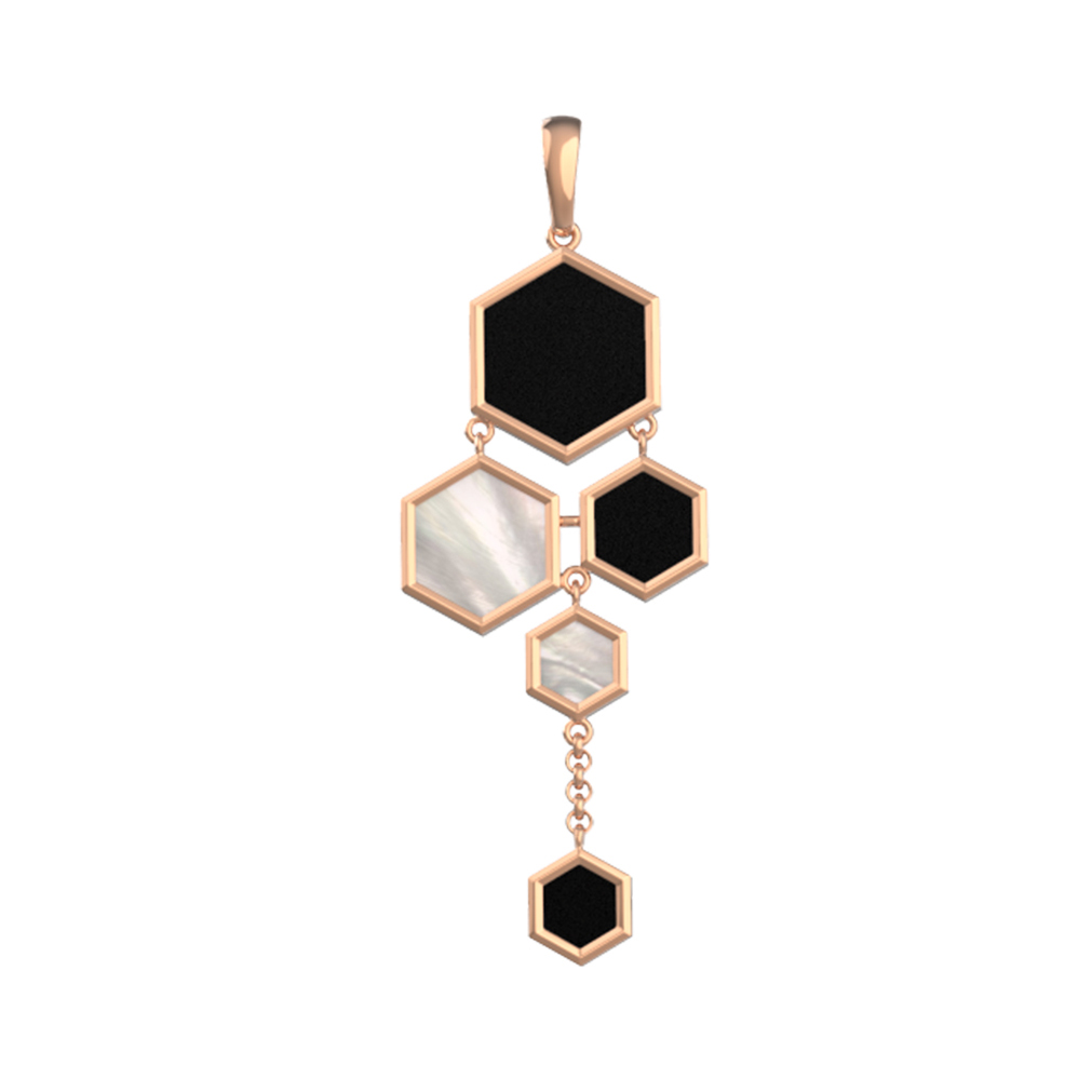 Подвеска из красного золота 585 пробы — это яркий пример ювелирного искусства, сочетающий в себе строгость геометрических линий и благородство натуральных материалов. Дизайн изделия, вдохновленный структурой молекулы, строится на основе шестигранных форм, которые создают динамичный и современный образ. Эта подвеска гармонично объединяет контрастные текстуры: глубокий черный оникс и переливчатый перламутр подчеркивают статус и безупречный вкус владельца.