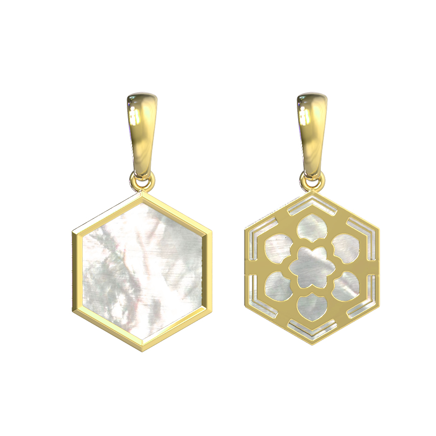 Вставка из перламутра шестигранной формы притягивает взгляд своим мягким переливом, создавая неповторимый контраст с лимонным оттенком золота. Изящная проработка деталей делает это украшение универсальным: лаконичность форм позволяет носить его как женщинам, так и мужчинам. Такая подвеска подчеркнет индивидуальность владельца и идеально дополнит как повседневный, так и вечерний наряд.