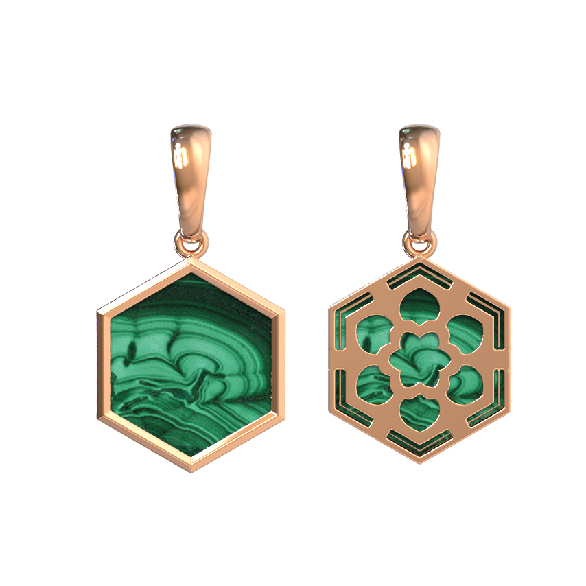Геометрическая точность форм является ключевой особенностью данной модели. Малахит имеет форму шестигранника и идеально вписан в оправу, создавая контрастное сочетание благородного металла теплого оттенка и яркого камня. С одной стороны, подвеска выглядит как минималистичная пластина, а с другой — демонстрирует ажурную конструкцию в виде молекулярной структуры, что придает украшению многогранность и оригинальность.