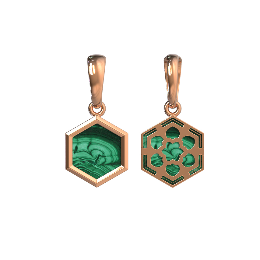 Элегантная подвеска из красного золота 585 пробы из коллекции De Luxe — Молекула станет стильным акцентом вашего образа. Дизайн украшения вдохновлен геометрией молекулы, что придает изделию современный и интеллектуальный вид. Центральным элементом композиции является вставка из природного малахита глубокого зеленого цвета. Камень огранен в форме шестигранника, что подчеркивает уникальность природного рисунка минерала и гармонично сочетается с четкими линиями золотой оправы.