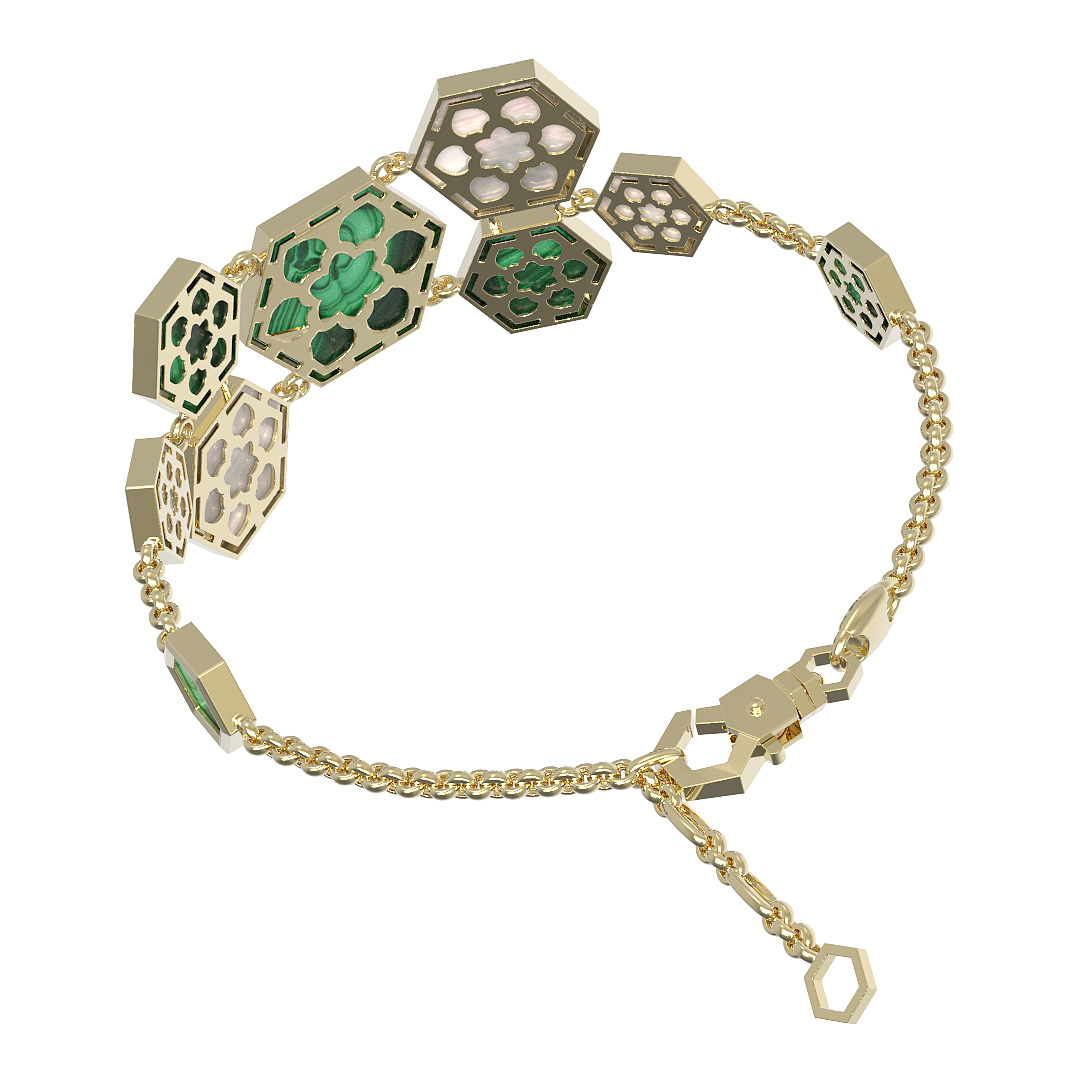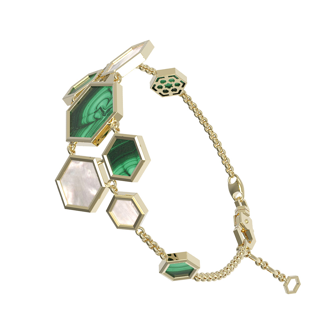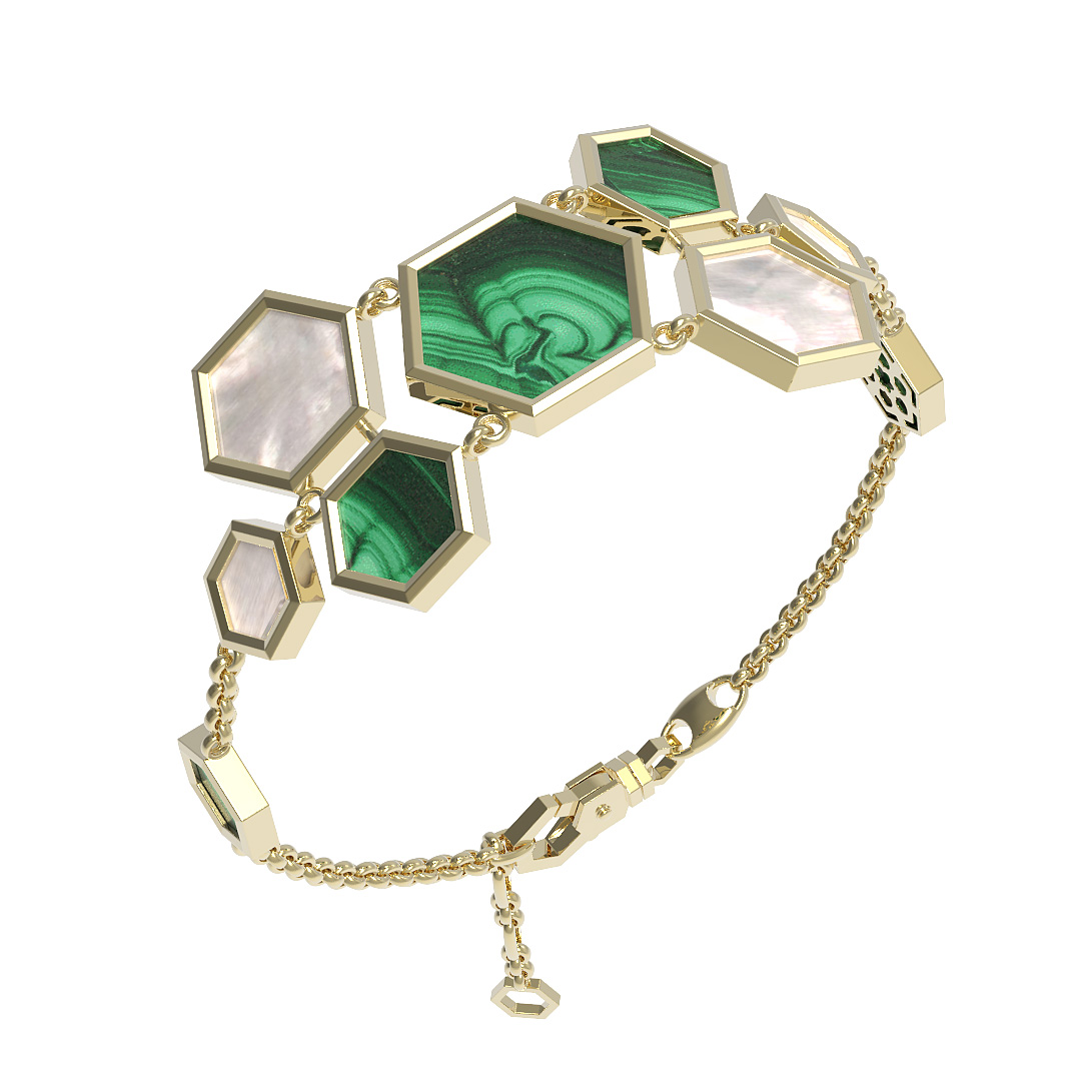 В центре композиции расположены пять вставок в форме шестигранника, которые придают изделию футуристичный вид. Контрастное сочетание насыщенного зелёного цвета малахита с нежным, переливающимся перламутром делает этот браслет по-настоящему притягательным. Теплый оттенок лимонного золота служит идеальной оправой, подчеркивая глубину природного камня и мягкое сияние перламутра.