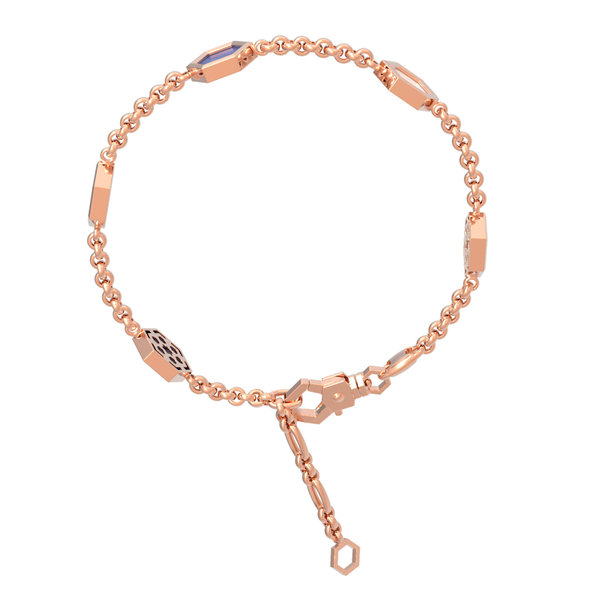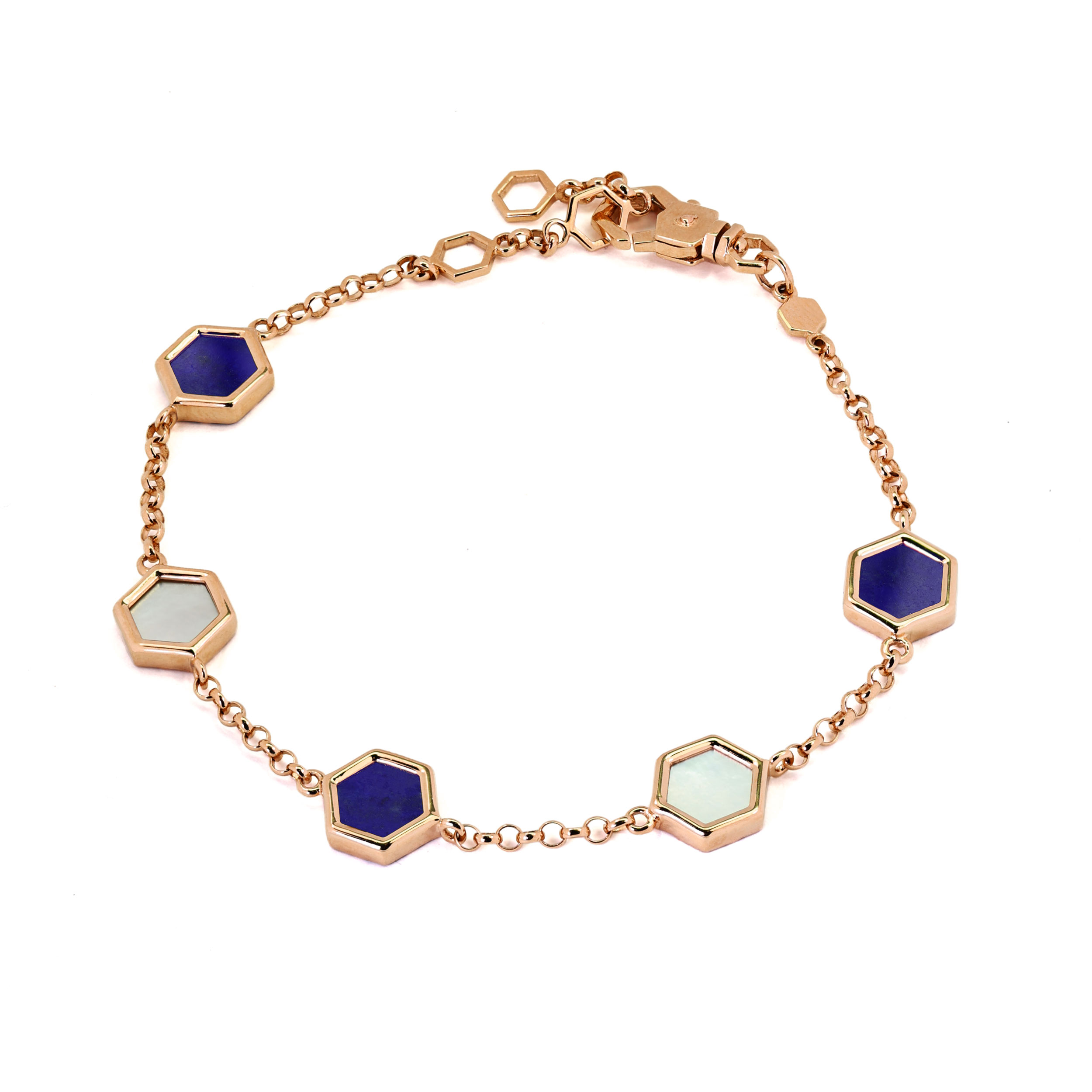 Центральными элементами композиции являются три вставки в форме шестигранника, которые придают украшению футуристический и стильный вид. Контрастное сочетание глубокого синего лазурита и нежного перламутра создает выразительную игру оттенков, которая приковывает взгляд. Тонкая, но прочная цепь из красного золота обеспечивает комфортную посадку на запястье и долговечность изделия.