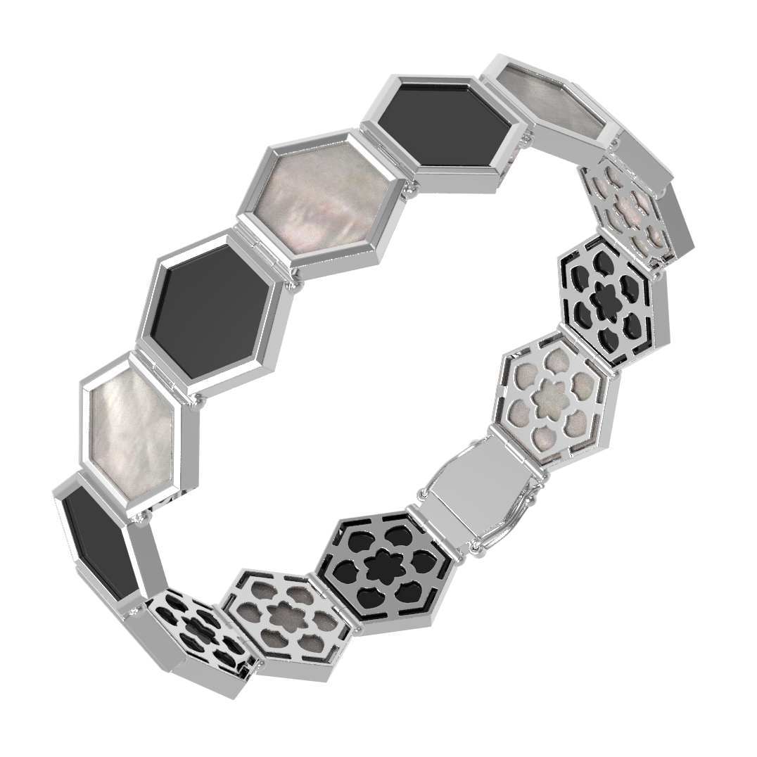 Основой композиции служат 14 вставок в форме шестигранника, которые чередуются между собой. Глубокий, насыщенный черный цвет оникса эффектно контрастирует с мягким, переливающимся блеском перламутра, создавая гармоничный дуэт. Белый металл подчеркивает благородство этих натуральных материалов, придавая браслету из серии De Luxe — Молекула завершенный и строгий вид.