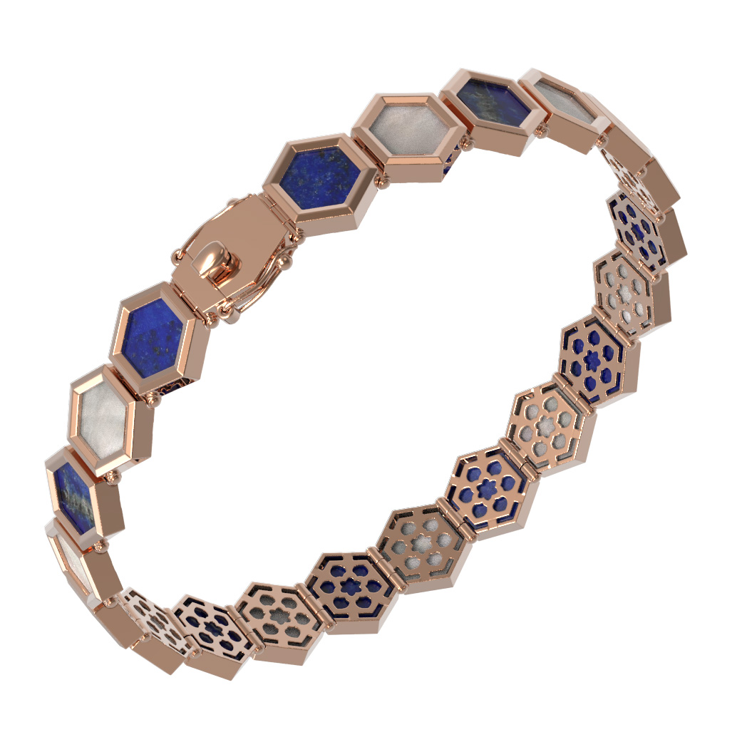 В центре композиции гармонично сочетаются два контрастных камня: глубокий синий лазурит и нежный перламутр. Всего браслет насчитывает 42 вставки правильной геометрической формы, которые чередуются между собой, создавая эффектный визуальный ритм на вашем запястье. Тщательная проработка деталей видна не только снаружи, но и с внутренней стороны звеньев, где узор повторяется в золоте.