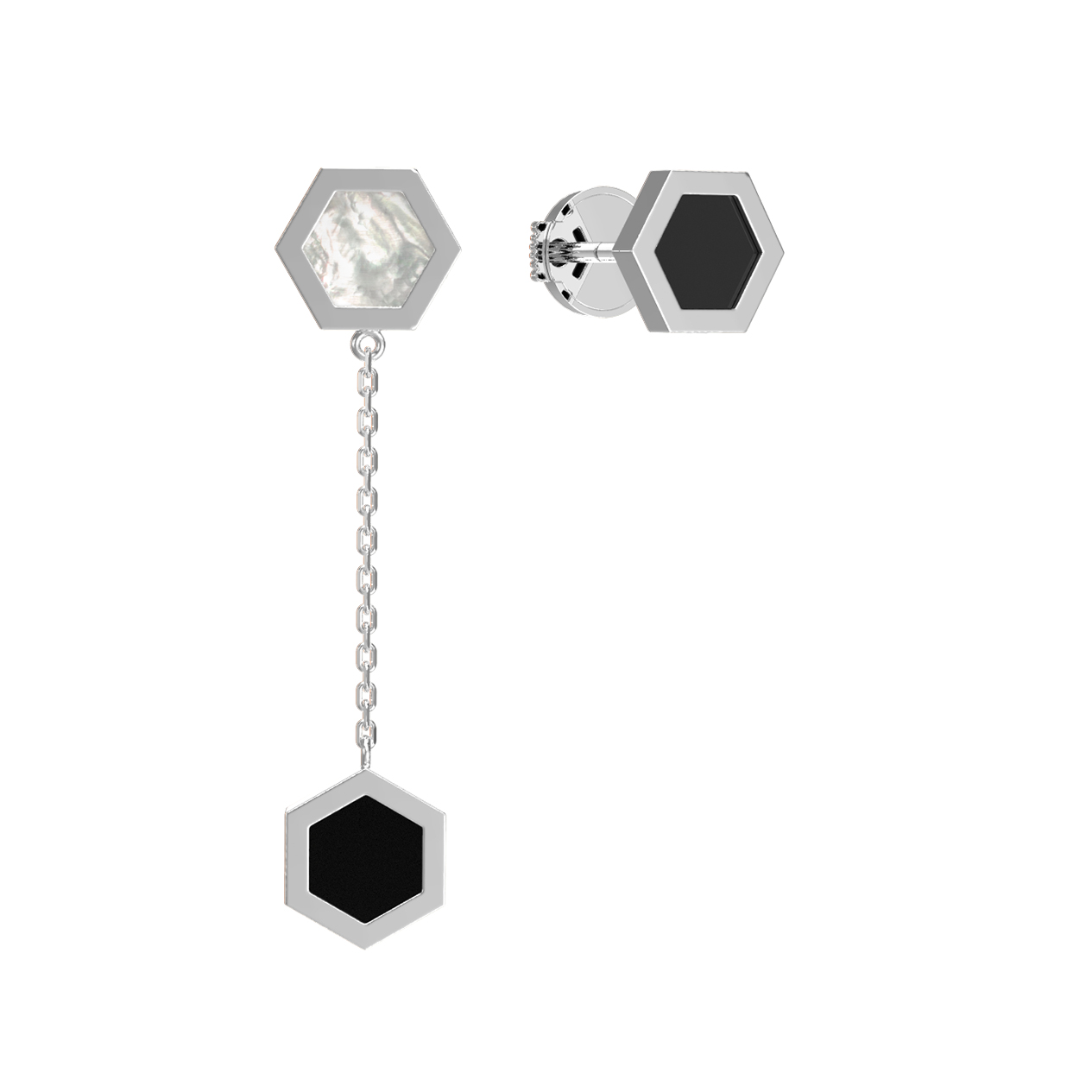 Особое очарование серьгам придает гармоничное сочетание контрастных материалов. Натуральный оникс глубокого черного цвета встречается с нежным перламутром, создавая выразительную игру света и тени. В дизайне использовано 2 вставки, которые подчеркивают благородный блеск белого золота. Конструкция изделия продумана до мелочей: лаконичная форма и изящная цепочка делают их динамичным аксессуаром, который притягивает взгляды и подчеркивает индивидуальность.