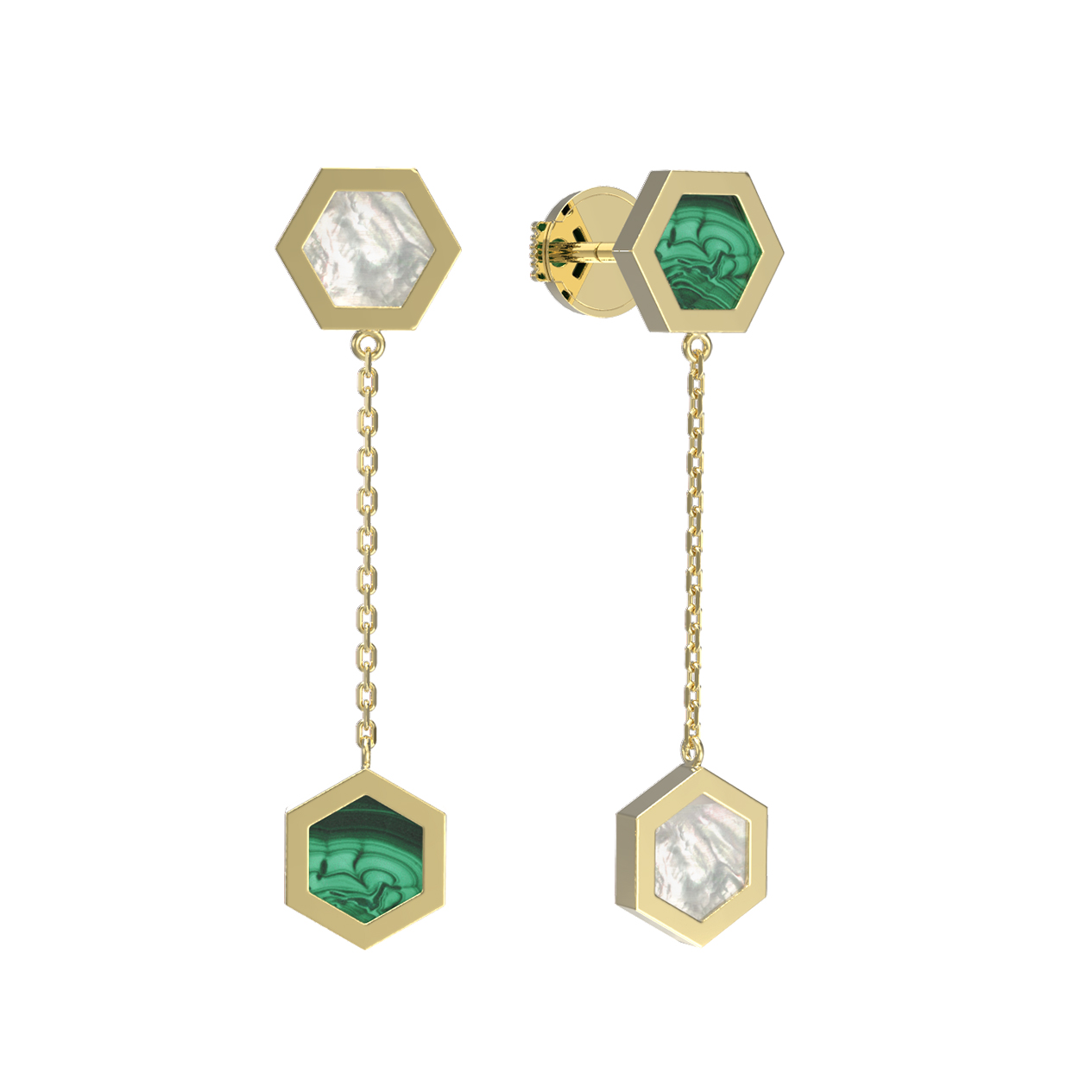 В центре композиции — контрастный дуэт природных материалов: насыщенный зеленый малахит с его неповторимым рисунком и нежный, переливчатый перламутр. В каждой серьге расположено по 2 вставки, создающих динамичную игру света при движении. Благодаря своей универсальной эстетике, эти серьги подходят как для женщин, так и для мужчин, предпочитающих современные ювелирные решения.
