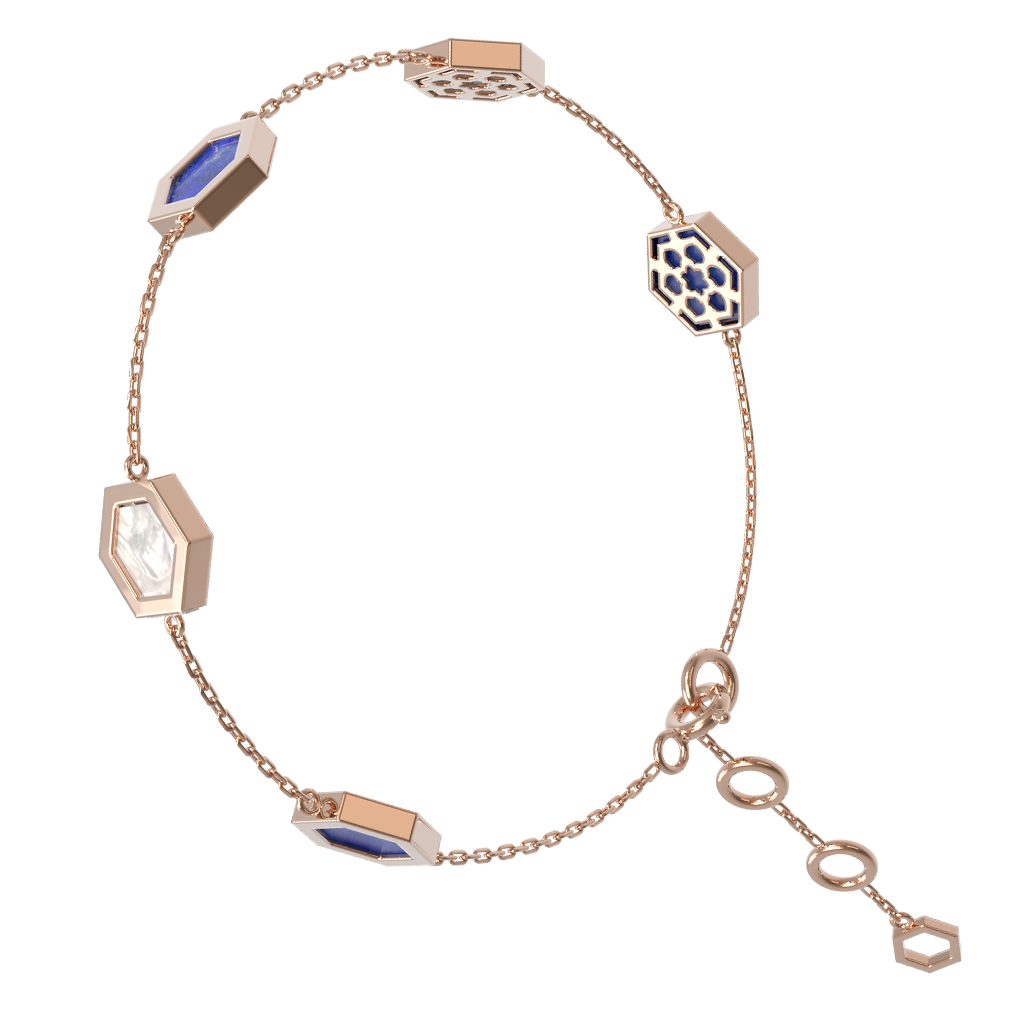 Центральными элементами композиции выступают три вставки в форме шестигранника. Глубокий синий цвет натурального лазурита эффектно соседствует с нежным, переливчатым перламутром, создавая выразительную игру оттенков. Лаконичная цепочка надежно соединяет декоративные элементы, обеспечивая комфортную посадку на запястье. Такой браслет универсален в своем исполнении: он одинаково органично смотрится как в женском, так и в мужском образе, подчеркивая индивидуальность владельца.