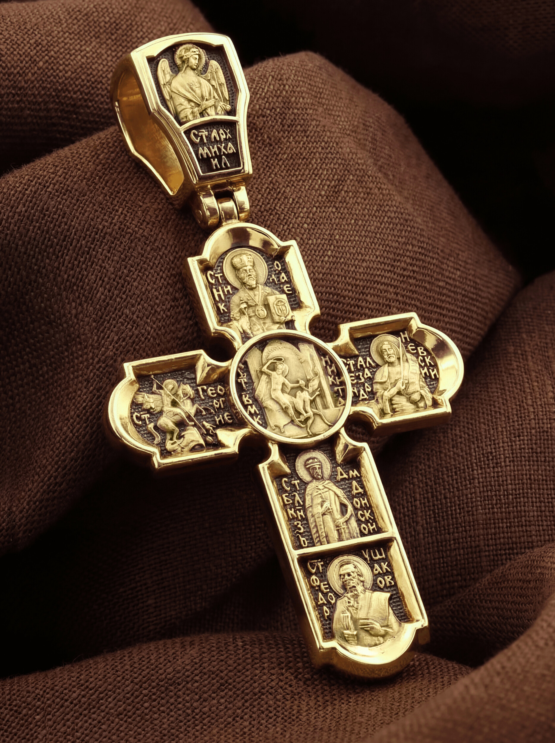 На лицевой стороне креста изображено Распятие Господа и Спасителя нашего Иисуса Христа. Христос, подвергнутый на кресте мучительной казни, своими страданиями искупил нас от древнего греха и даровал нам жизнь вечную. Без Распятия не было бы Воскресения Христова, и поэтому Крест из орудия казни обратился в святыню, в которой действует Благодать Божия. Над Распятием изображен Дух Святой в виде голубя, сходящего с Небес. Распятие сопровождается каноническими надписями. На верхней табличке, выше головы Иисуса, расположена надпись, составленная Понтием Пилатом на трех языках — «IНЦI». Она означает «Иисус Назорей, Царь Иудейский». Надпись «IС ХС» означает Иисус Христос и помещается на разных сторонах поперечной (большой) перекладины креста. Ниже — словосочетание «СЫН БОЖИЙ», что означает божественную природу Иисуса Христа. Крест стоит на горе камней, символизирующих Голгофу. В ее основании различается череп — это голова Адама. Надписи «Ника», что означает Победитель, и надпись «МЛРБ» — «место лобное рай бысть», что означает место лобное стало раем, размещены в нижней части креста. На кулонном кольце изображен шестикрылый Серафим.
