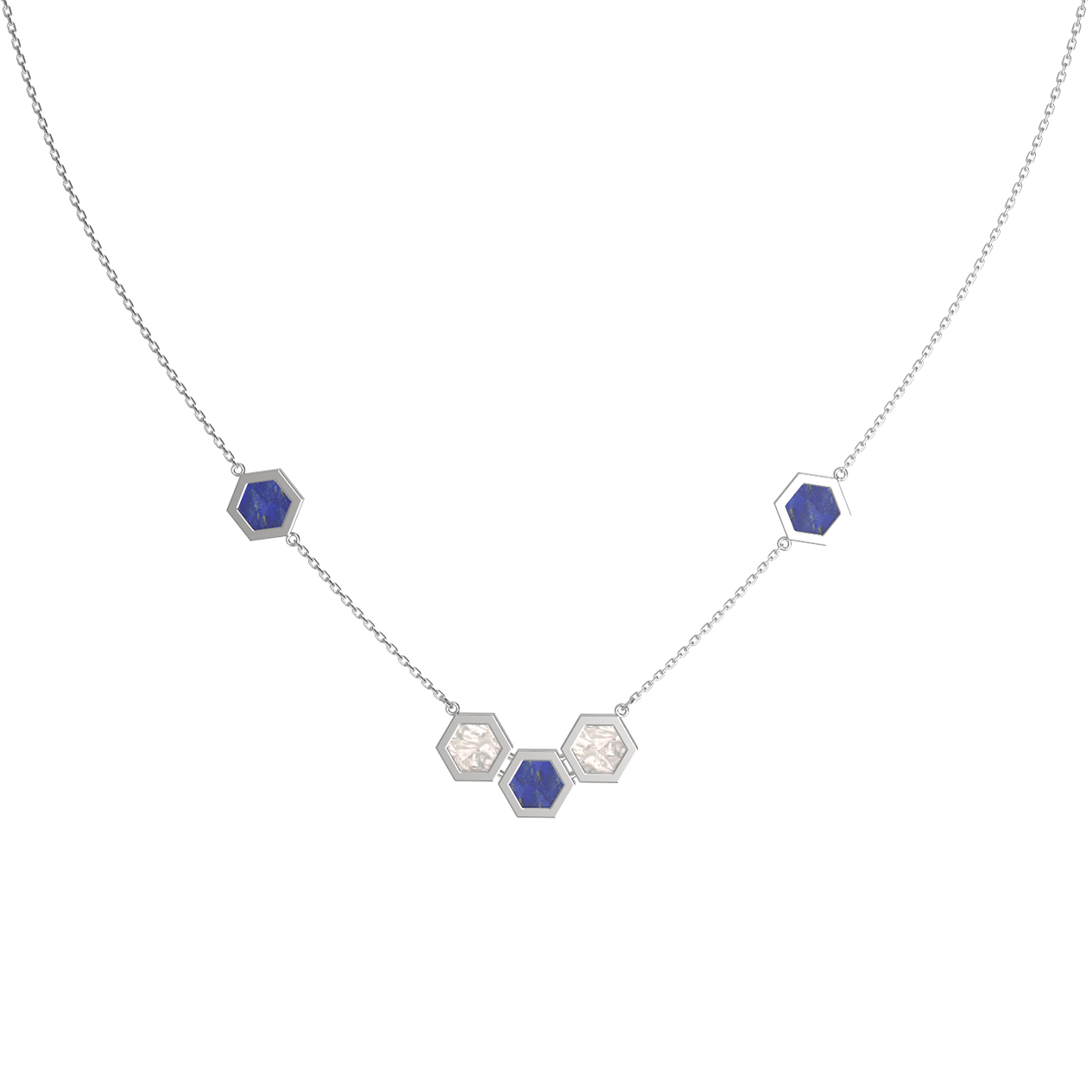 Колье из белого золота 585 пробы из коллекции De Luxe — Молекула воплощает собой оригинальный взгляд на современную ювелирную эстетику. Дизайн украшения вдохновлен структурой молекулы, где центральным элементом выступает геометрически выверенная форма шестигранника. Лаконичная, но выразительная композиция дополнена девятью вставками, гармонично сочетающими глубокий синий цвет лазурита и нежное сияние перламутра.