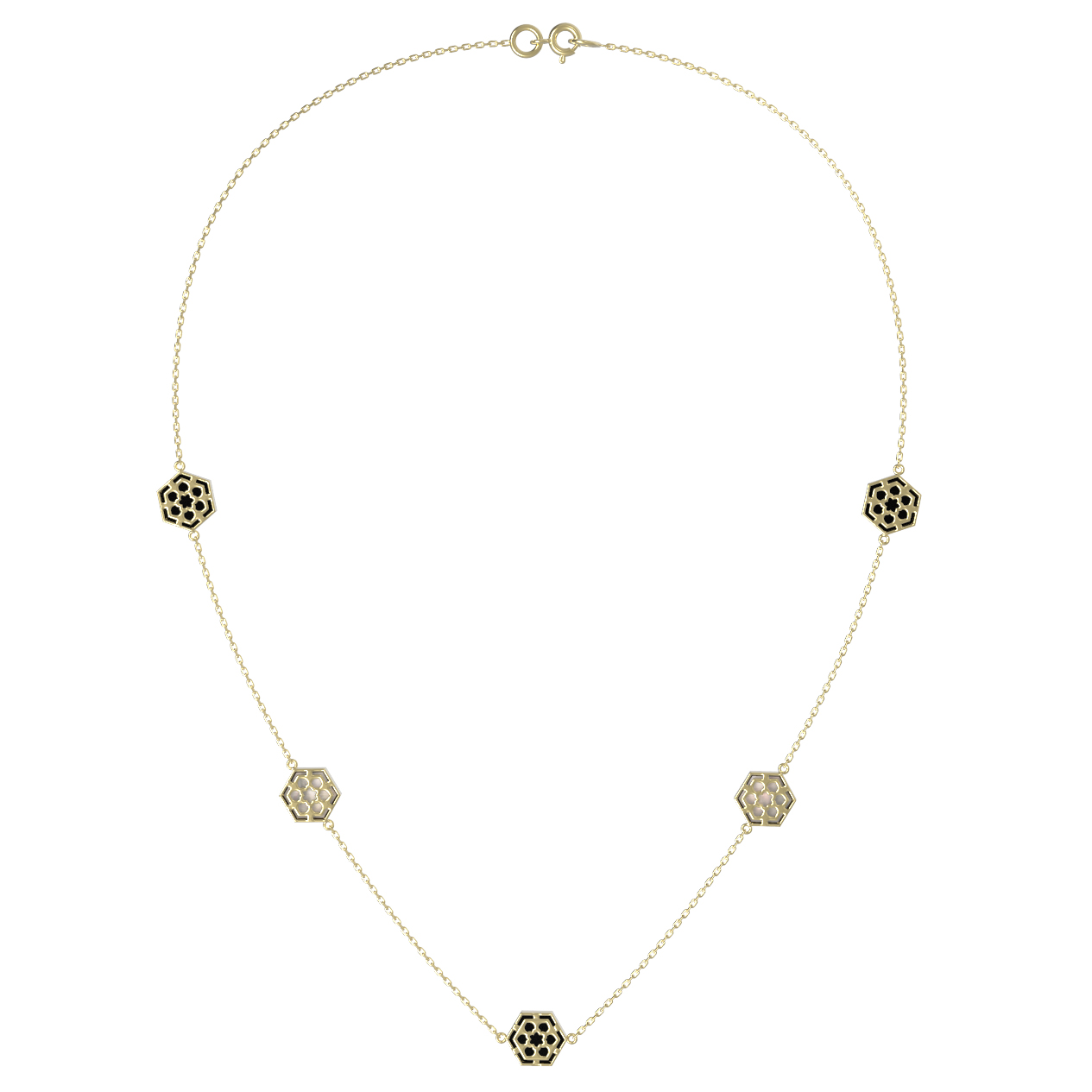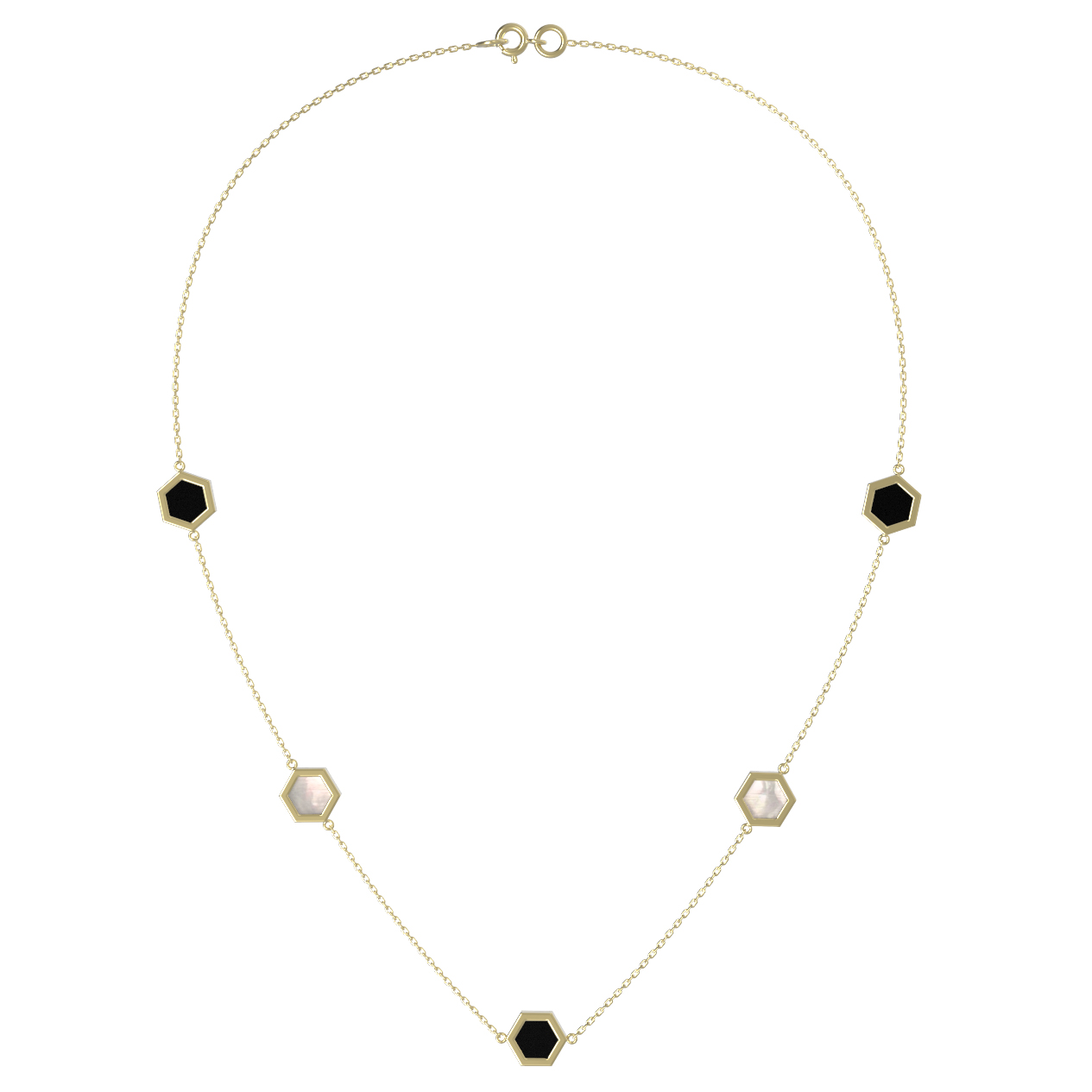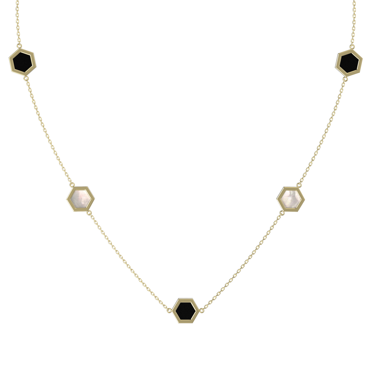 Центральным элементом композиции стали 9 вставок правильной формы шестигранника, которые гармонично распределены по всей длине цепочки. Сочетание благородного черного оникса и нежного переливчатого перламутра создает изысканный контраст, придавая образу особую глубину. Лимонный оттенок золота добавляет изделию яркости и теплоты.