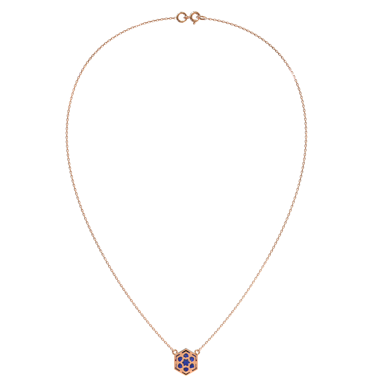 Изысканное колье из красного золота 585 пробы станет утонченным дополнением вашего образа. Украшение выполнено в оригинальном дизайне Молекула и привлекает внимание своей геометрической точностью. Центральным элементом изделия является вставка из натурального лазурита глубокого синего цвета. Форма вставки выполнена в виде правильного шестигранника, что придает колье современный и минималистичный характер.