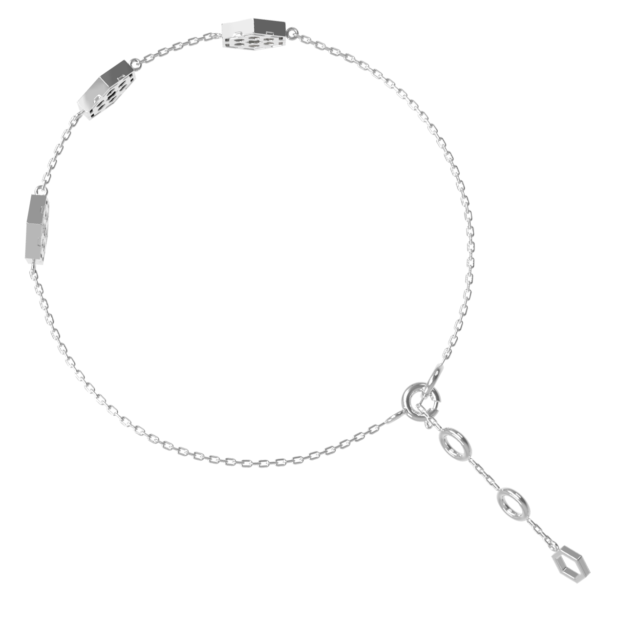 Элегантный и лаконичный браслет из белого золота 585 пробы — это воплощение современной геометрии в ювелирном искусстве. Дизайн Молекула делает это украшение по-настоящему особенным, превращая привычный аксессуар в значимый стилевой акцент. Центральным элементом композиции стали вставки в форме шестигранника, которые придают изделию четкость линий и изысканную строгость.