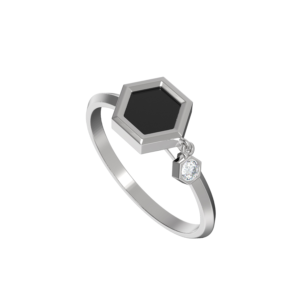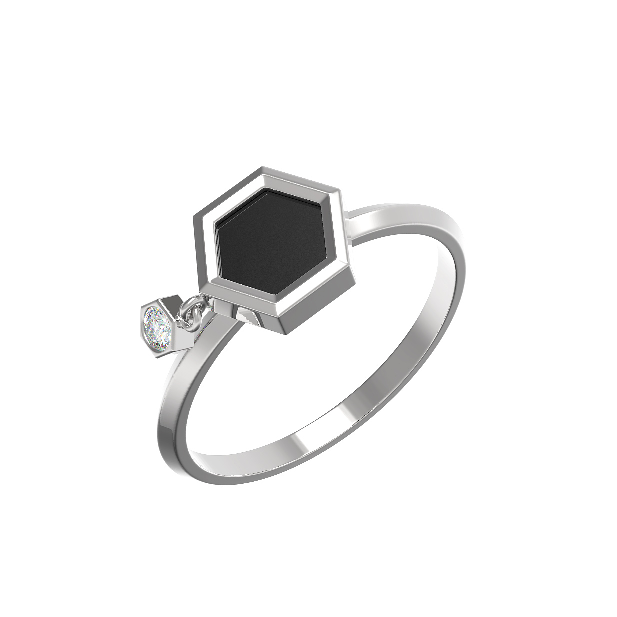 Элегантное кольцо из белого золота 585 пробы станет утонченным акцентом в вашем образе. Дизайн изделия, вдохновленный концепцией молекулы, воплощает в себе гармонию строгих геометрических форм и природной красоты драгоценных камней. В центре композиции расположен эффектный шестигранник с вставкой из глубокого черного оникса, который создает выразительный контраст с холодным блеском металла. Рядом, словно частица структуры, закреплен подвижный элемент с сияющим бриллиантом круглой формы, добавляющий украшению динамики и особого шарма.