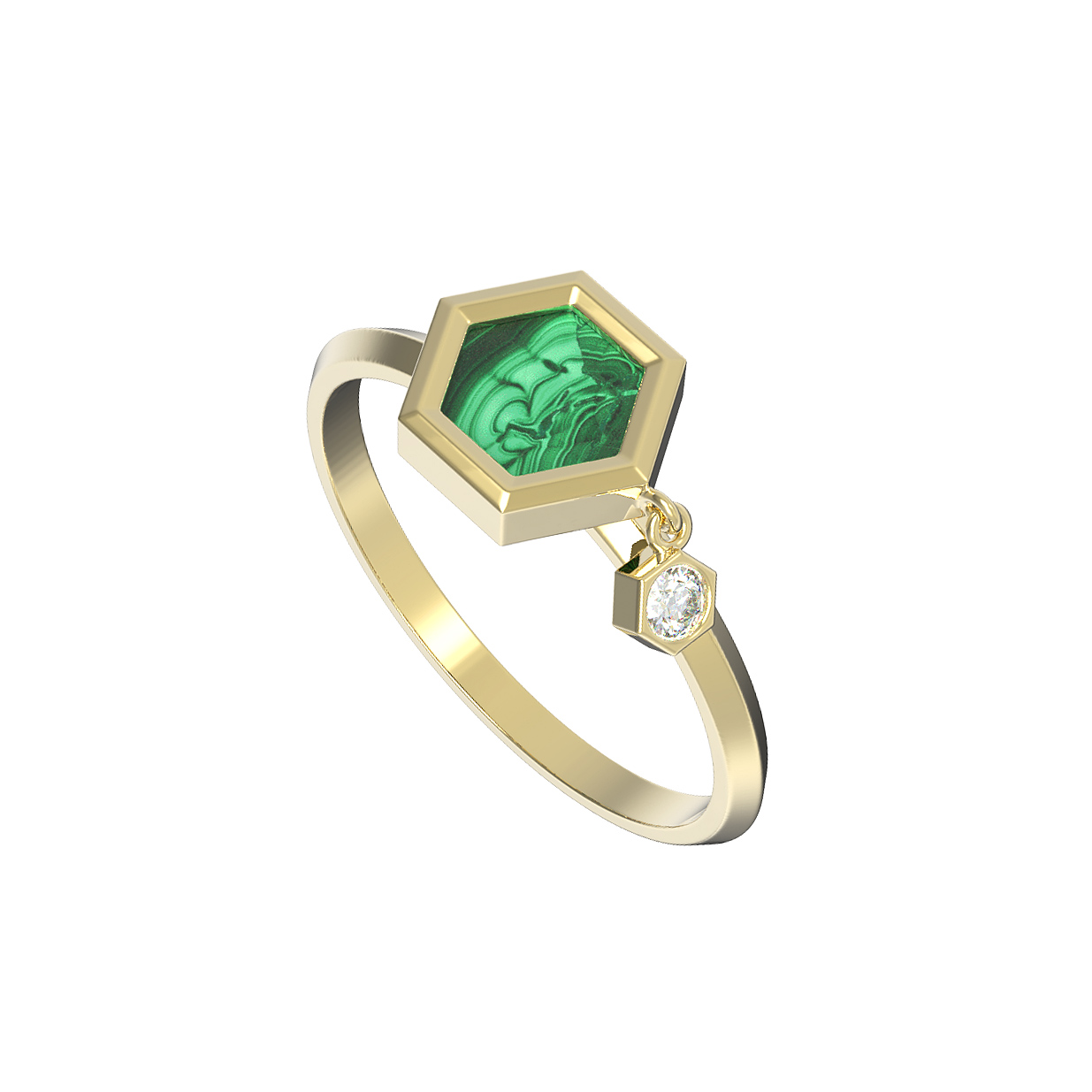 Композицию дополняет изящный подвижный элемент в форме миниатюрного шестигранника с сияющим бриллиантом белого цвета. Использование двух вставок разных фактур создает гармоничный контраст, который делает украшение запоминающимся и статусным. Лимонный оттенок золота придает кольцу особый теплый блеск, выгодно выделяя глубину малахитового узора.
