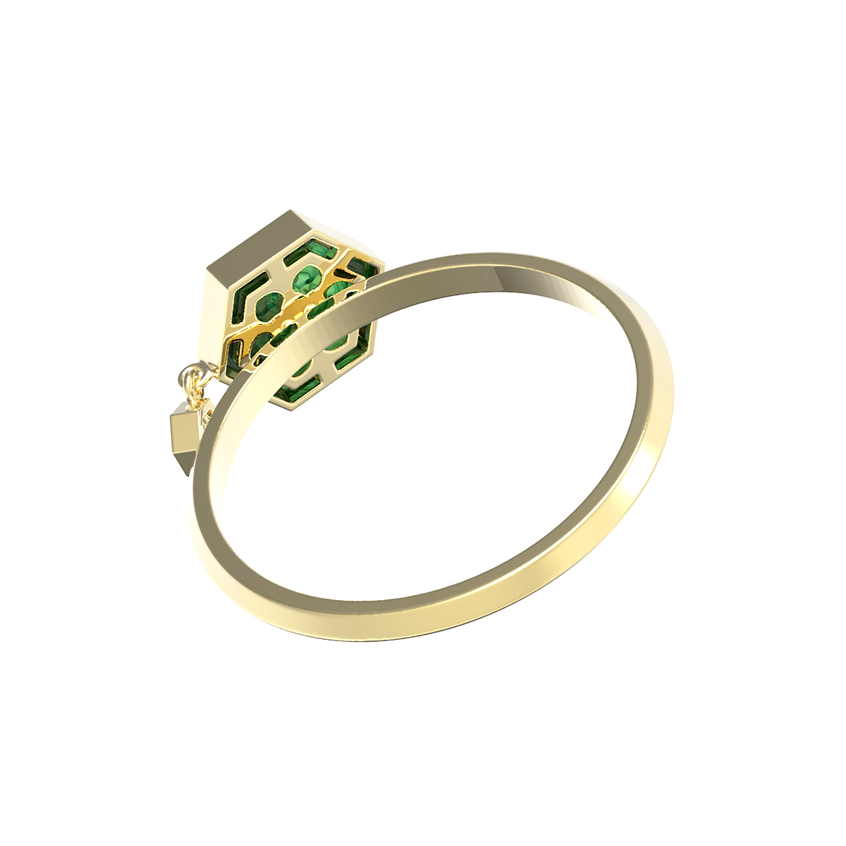 Откройте для себя совершенство ювелирного искусства с кольцом из лимонного золота 585 пробы из коллекции De Luxe — Молекула. Это украшение в уникальном дизайне Молекула притягивает взгляд своей геометрической выверенностью и благородным сочетанием материалов. В центре внимания находится эффектная вставка из малахита насыщенного зелёного цвета, ограненная в форму шестигранника, что подчеркивает современный и динамичный характер изделия.
