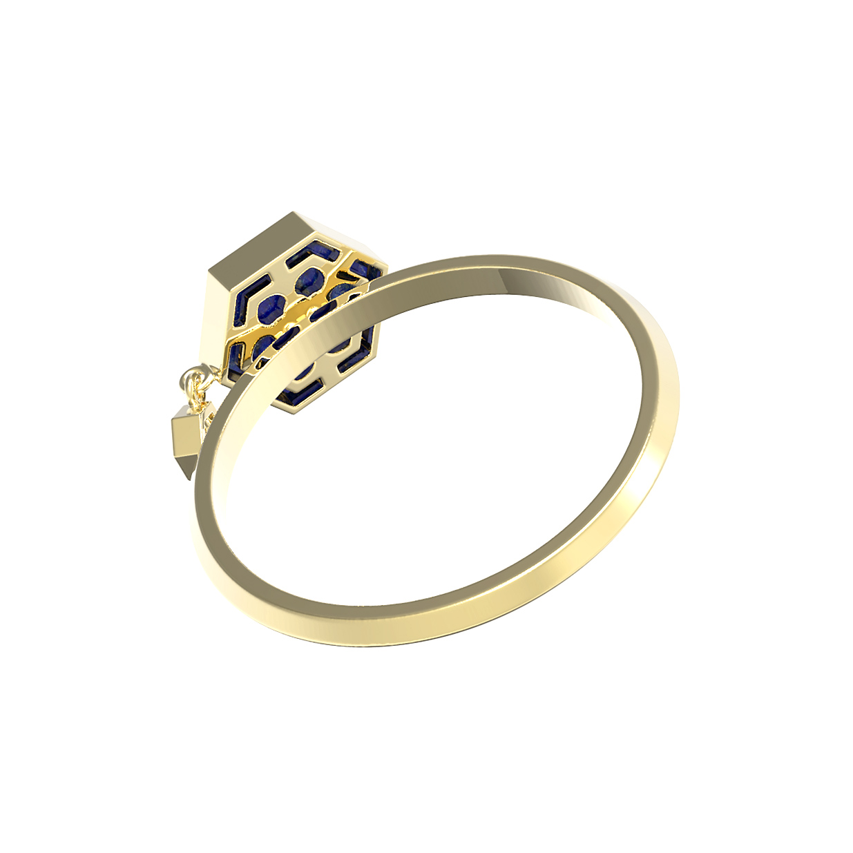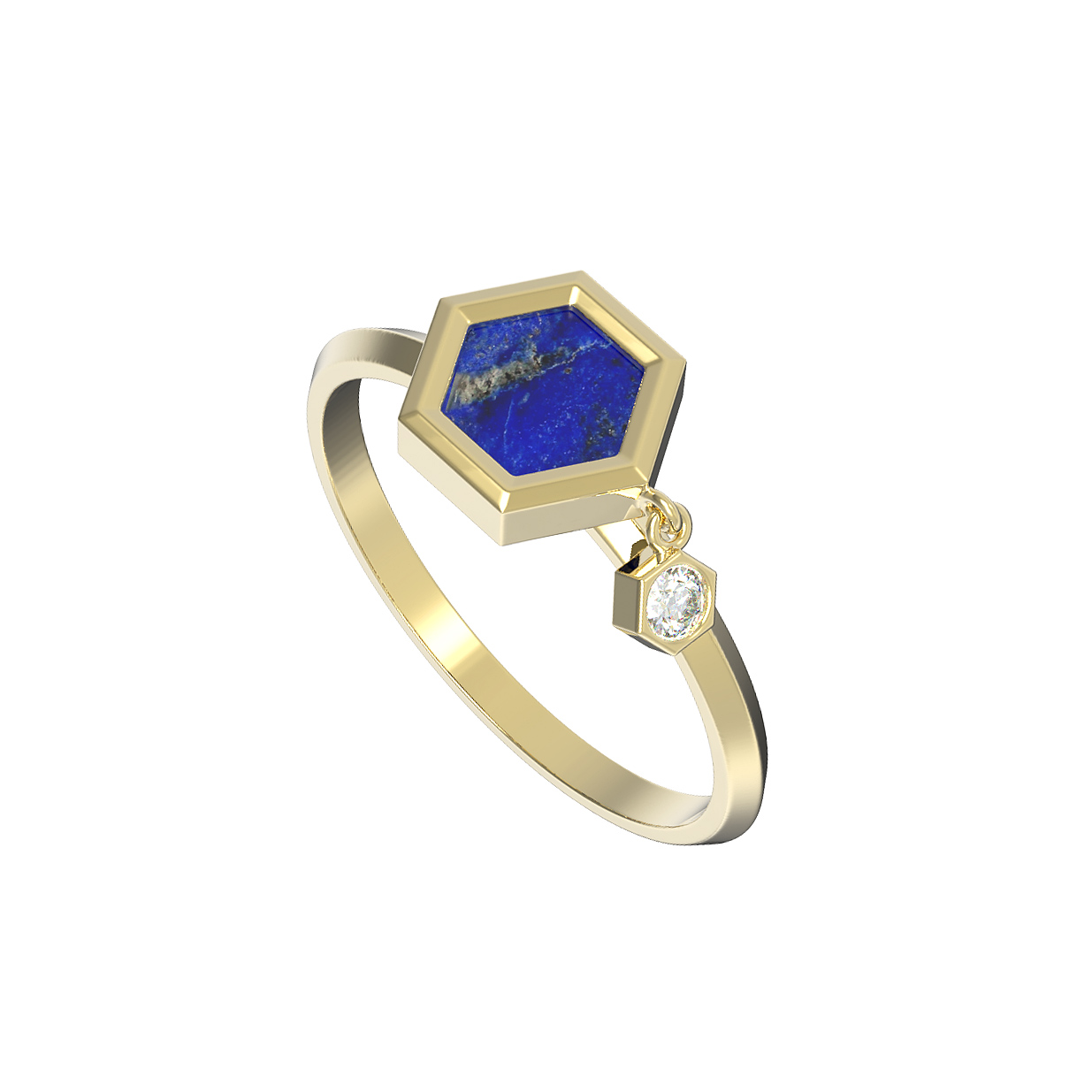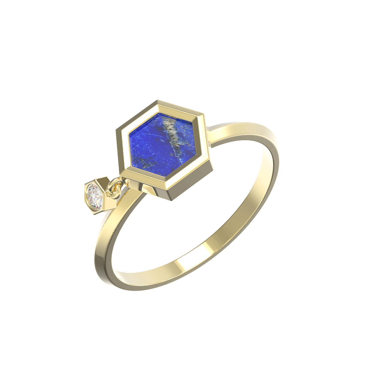 Откройте для себя эстетику современной геометрии с изысканным кольцом из лимонного золота 585 пробы. Это ювелирное изделие, вдохновленное концепцией дизайна Молекула, объединяет строгость линий и роскошь драгоценных материалов, создавая уникальный образ для мужчин и женщин. Особенностью модели является сочетание двух контрастных вставок: глубокого синего лазурита шестигранной формы и сияющего белого бриллианта круглой огранки. Гармоничное взаимодействие металла лимонного оттенка и природного минерала подчеркивает статусность украшения.