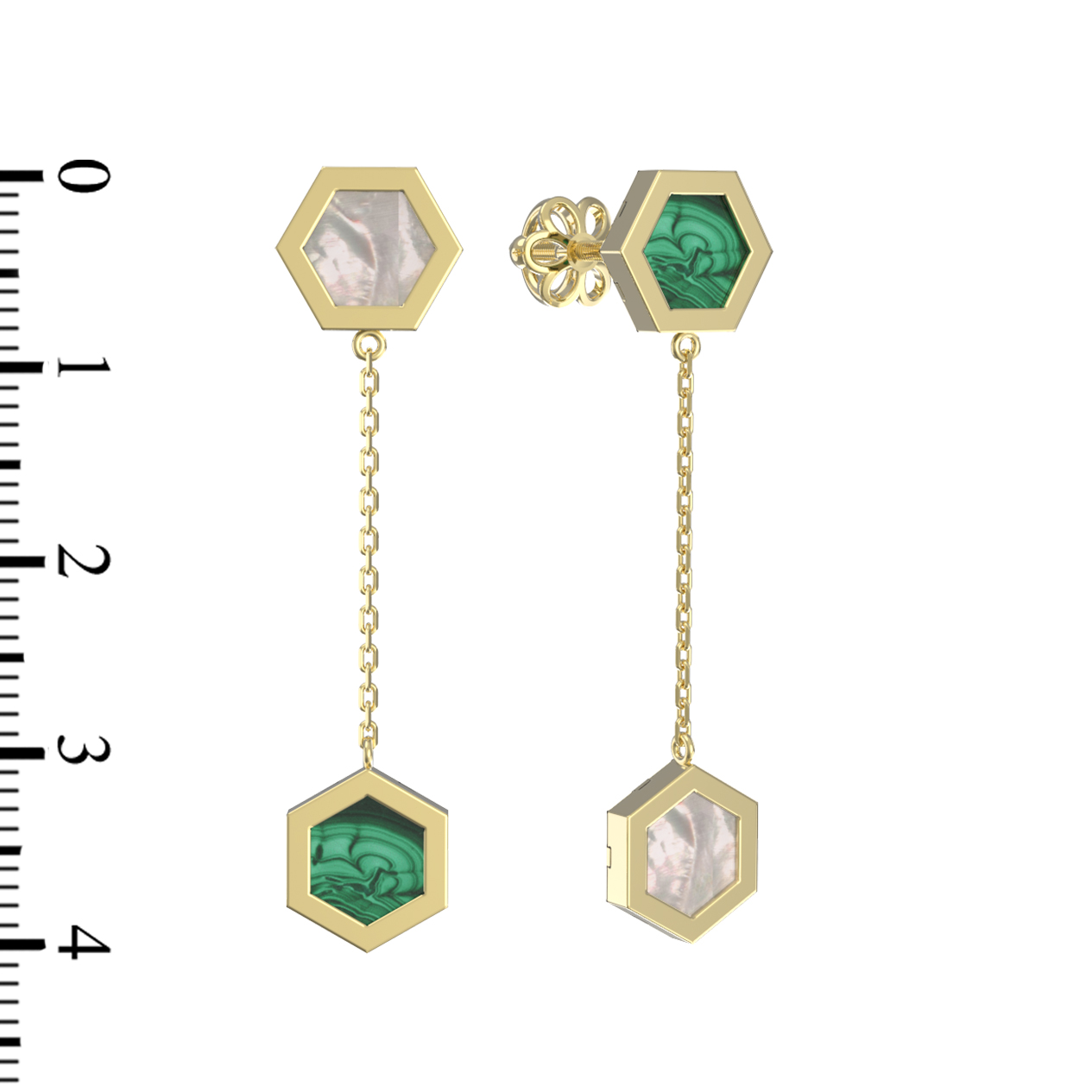 Дизайн модели вдохновлен структурой молекулы, что выражается в использовании четких форм. В центре внимания — вставки из малахита и перламутра, выполненные в виде правильных шестигранников. Зеленый оттенок малахита с его неповторимым природным рисунком гармонично контрастирует с нежным перламутровым переливом, создавая эффектный и сбалансированный дуэт. В каждой паре серег используется 2 вставки, которые притягивают взгляд своим качественным исполнением и яркостью.