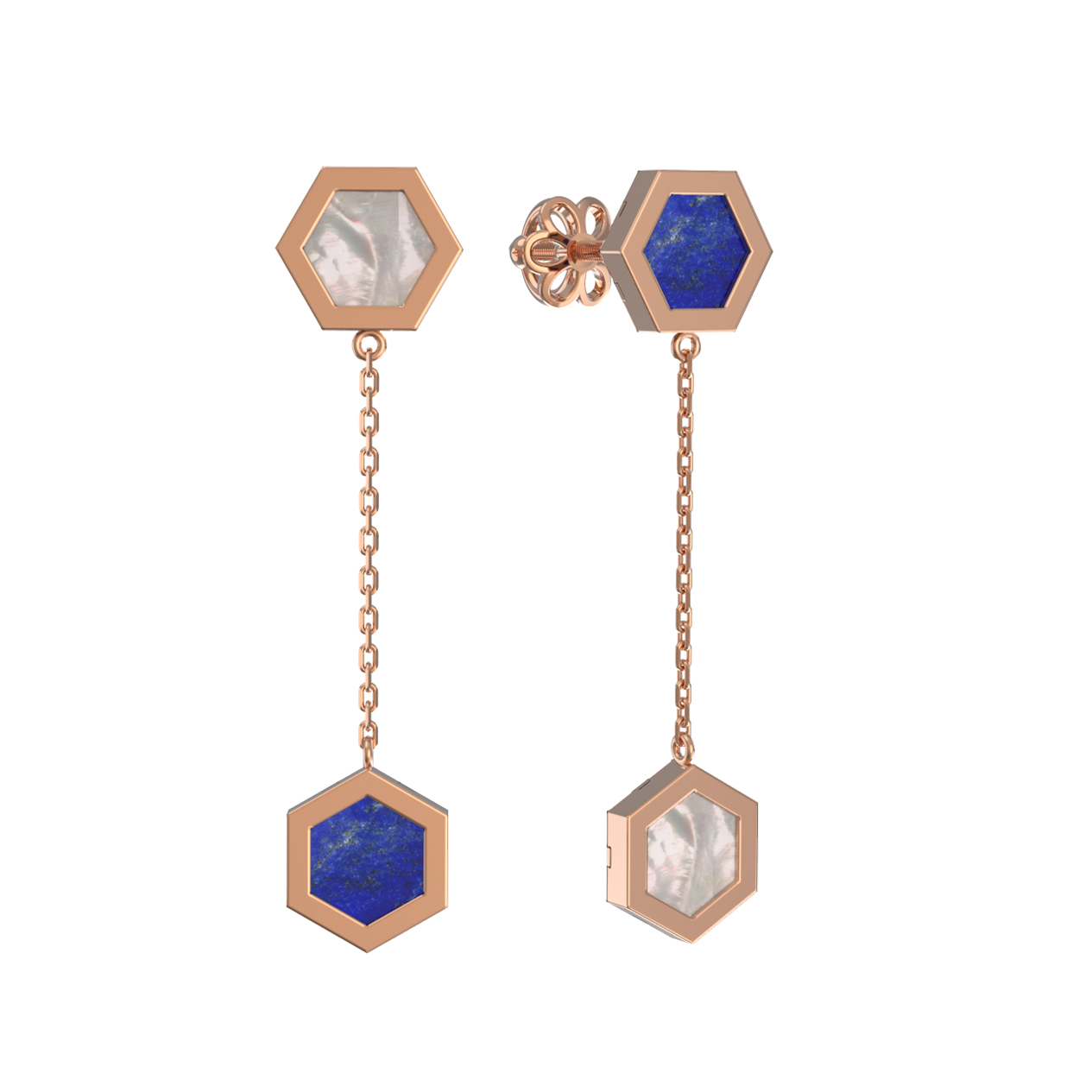 Серьги выполнены из красного золота 585 пробы, чей теплый оттенок идеально подчеркивает контраст вставок. Центральными элементами выступают два шестигранника, инкрустированные лазуритом и перламутром. Глубокий синий цвет лазурита создает эффектное сочетание с нежным сиянием перламутра, придавая композиции глубину и выразительность. Общее количество вставок составляет 2 штуки, гармонично распределенных в дизайне.