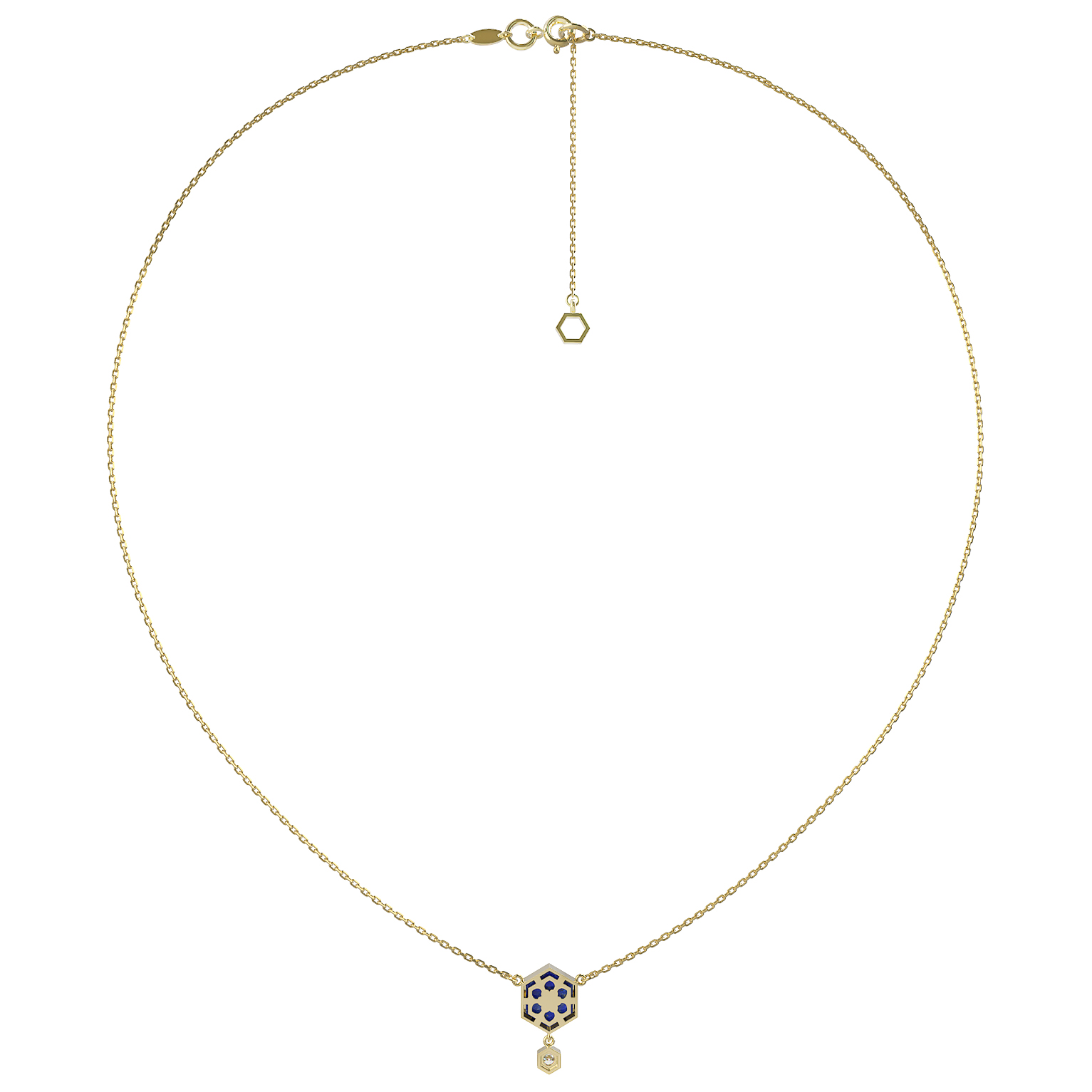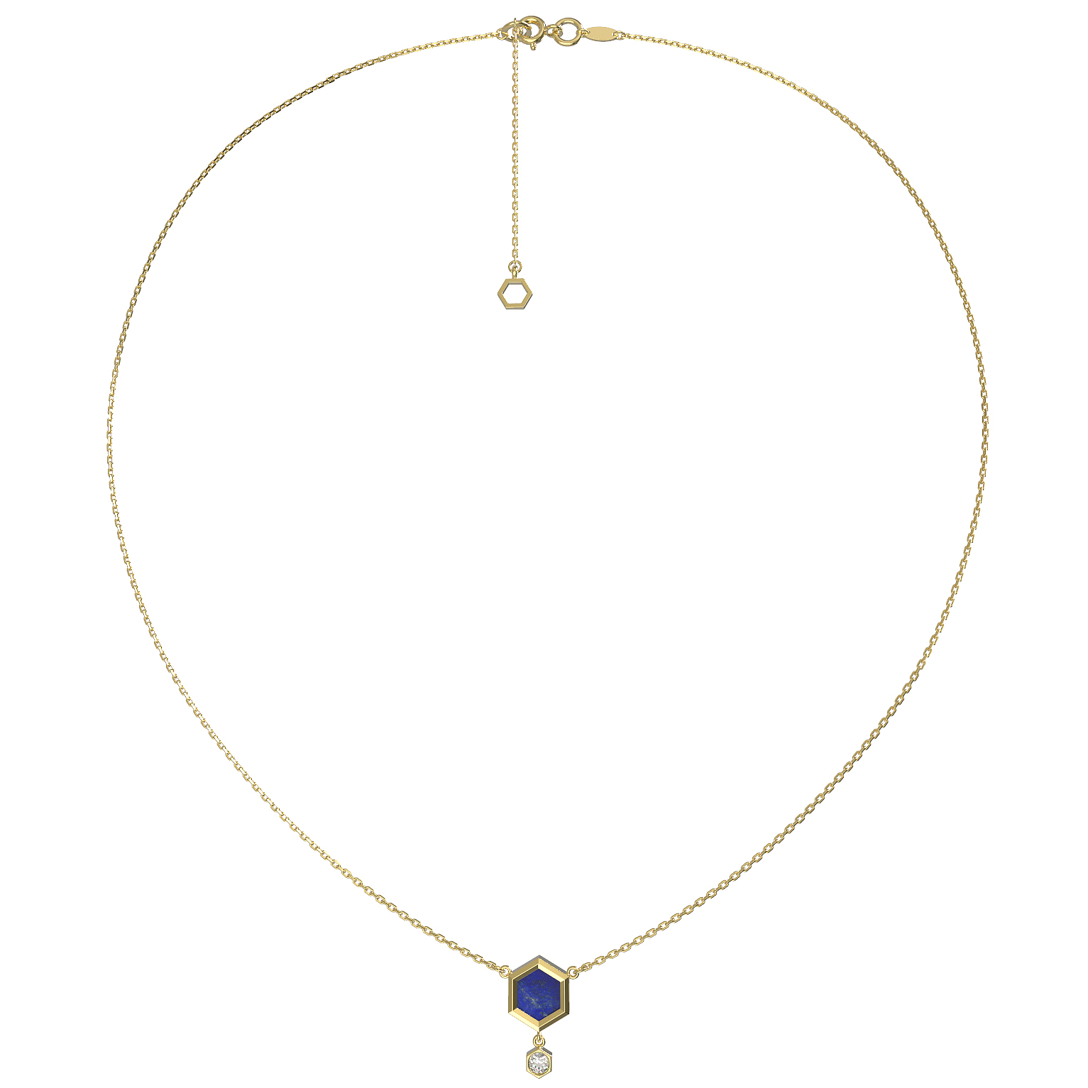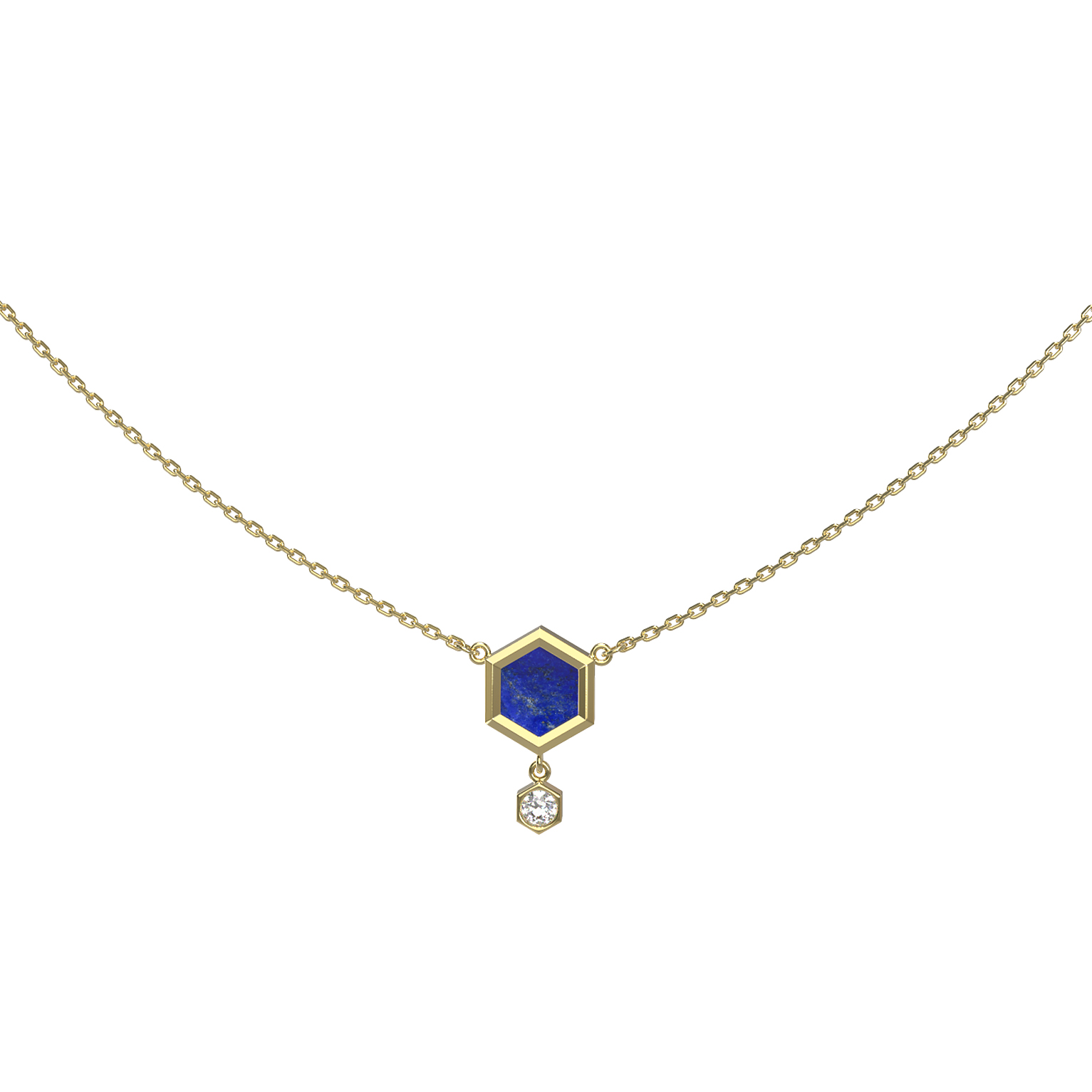 Элегантное колье из лимонного золота 585 пробы станет ярким акцентом вашего образа. Дизайн украшения, вдохновленный эстетикой молекулы, сочетает в себе геометрическую строгость и благородство материалов. Центральным элементом композиции является выразительная вставка из лазурита синего цвета, выполненная в форме шестигранника, которая гармонично дополнена сияющим бриллиантом круглой огранки. Общее количество вставок составляет 4, что придает изделию изысканный и завершенный вид.