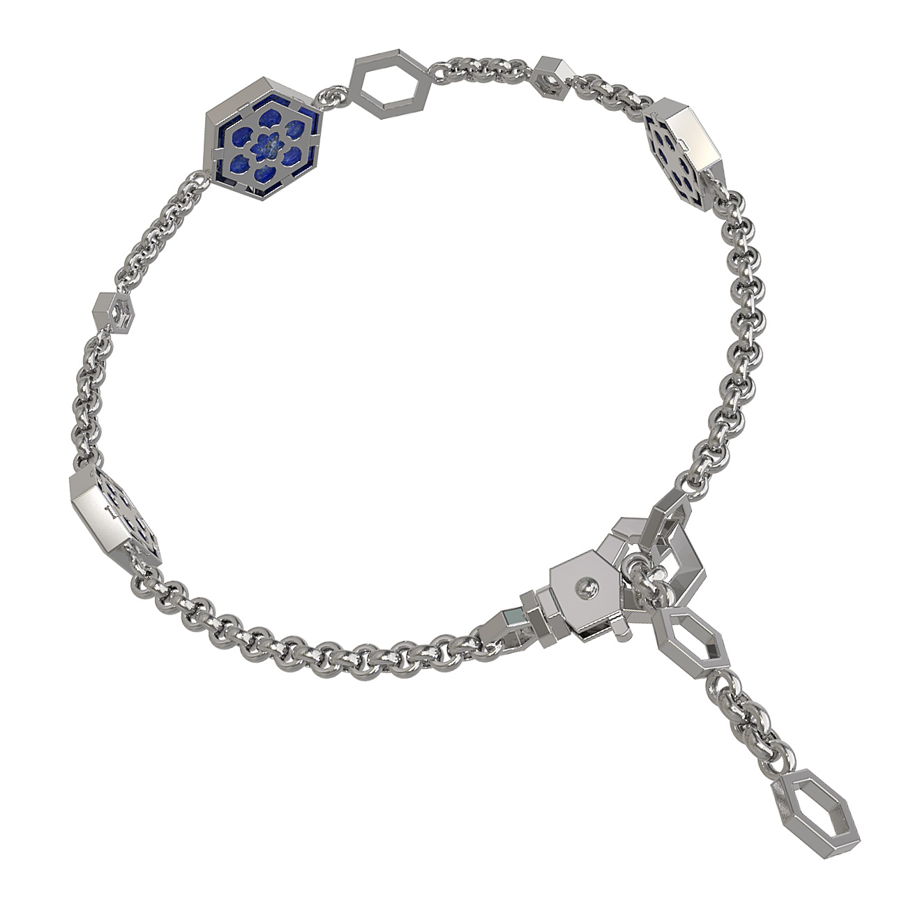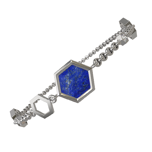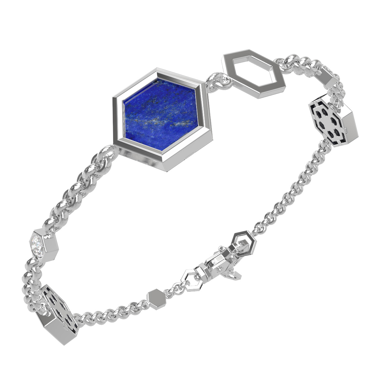 В центре композиции находится яркий синий лазурит в форме шестигранника, который контрастирует с нежным перламутром и холодным блеском белого золота. Три вставки, включая сияющий бриллиант, придают украшению особый шарм и выразительность. Общая цветовая палитра — белый, синий и перламутровый оттенки — позволяет легко сочетать этот браслет как с повседневным, так и с вечерним образом.