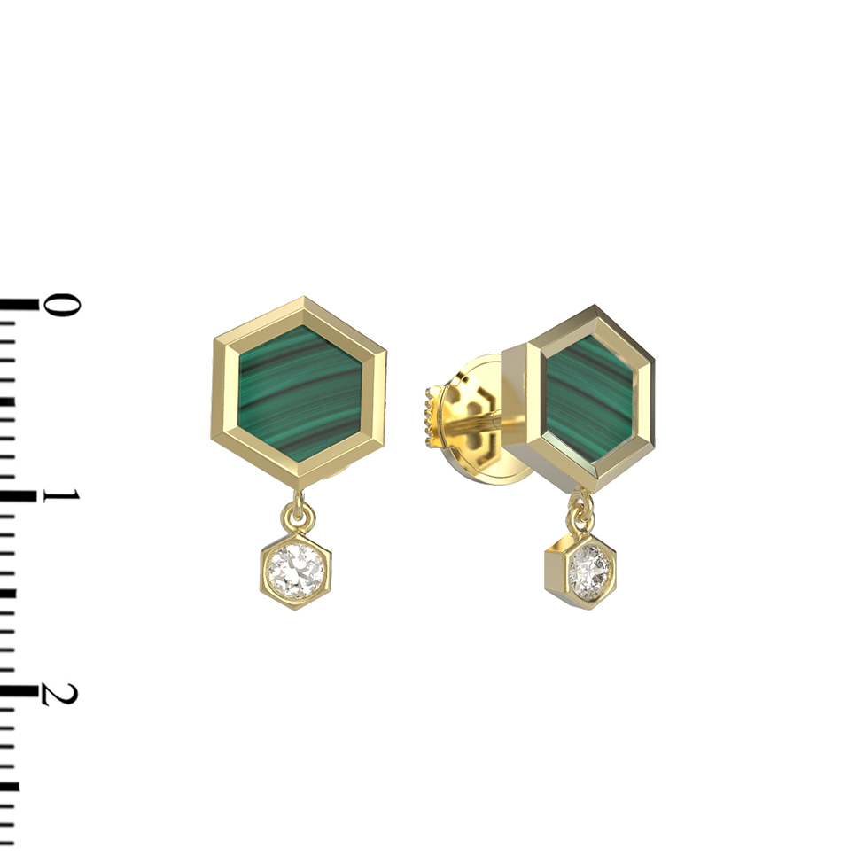 Серьги из лимонного золота 585 пробы из коллекции De Luxe — Молекула воплощают в себе смелый геометрический стиль и элегантность. Дизайн Молекула акцентирует внимание на четких линиях и гармоничном сочетании форм, превращая классическое ювелирное украшение в современный арт-объект. В основе композиции лежит шестигранник, декорированный насыщенным малахитом зеленого цвета, который дополняет сияющий бриллиант круглой формы.