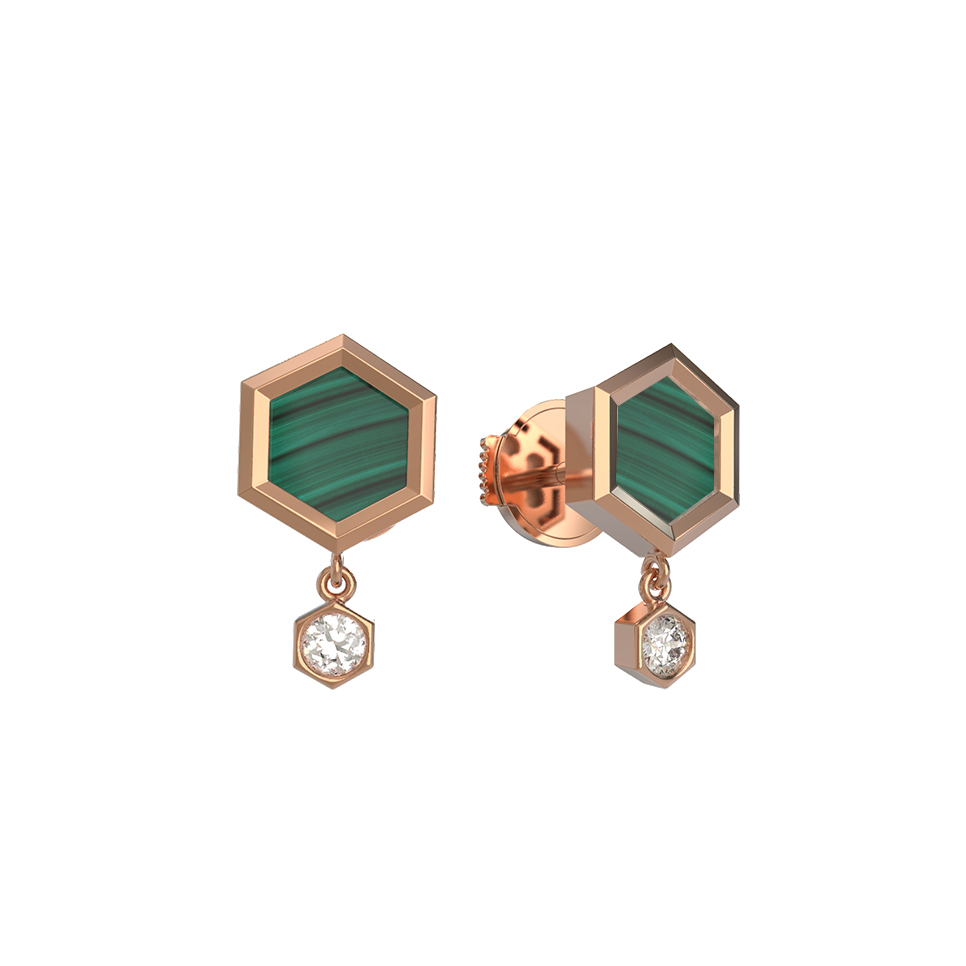 Элегантные серьги из коллекции De Luxe — Молекула станут ярким акцентом вашего образа. Дизайн украшения, вдохновленный структурой молекулы, подчеркивает современный подход к ювелирному искусству. Изделие выполнено из красного золота 585 пробы, чей теплый оттенок гармонично сочетается с насыщенным зеленым цветом малахита. Вставка из малахита имеет форму шестигранника, что придает украшению геометрическую четкость и стиль.