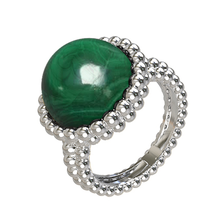 Элегантное кольцо из белого золота 585 пробы из коллекции De Luxe — Сферы станет безупречным дополнением вашего образа. Это классическое ювелирное украшение привлекает внимание гармоничным сочетанием благородного металла и природного камня. Центральным элементом дизайна является крупная вставка — малахит насыщенного зеленого цвета, ограненный в форме идеального круга. Глубокий, естественный оттенок камня великолепно раскрывается на фоне холодного блеска белого золота, подчеркивая статусность и безупречный вкус владельца.