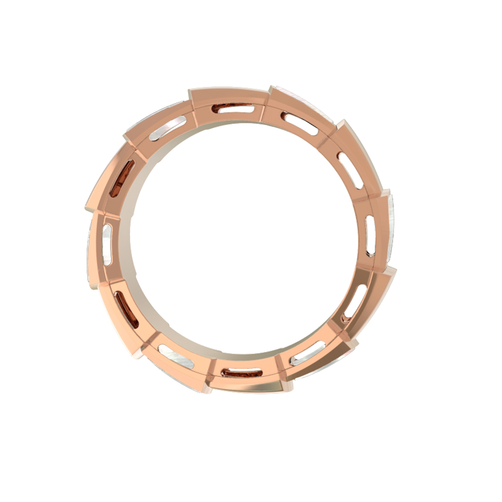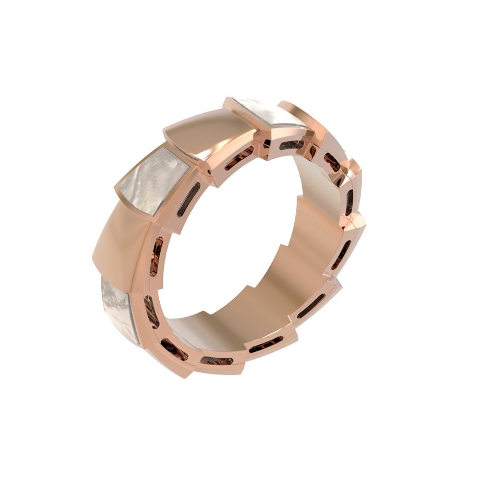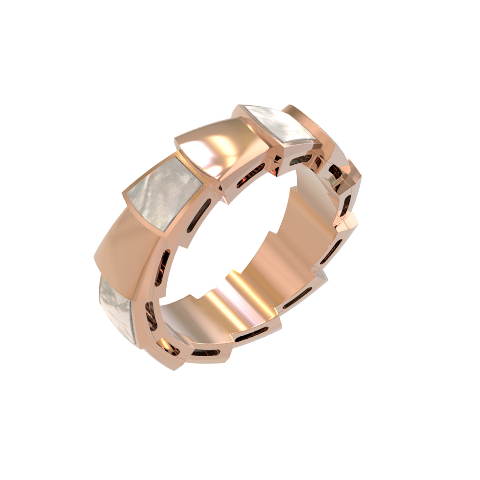 Кольцо выполнено из качественного красного золота 585 пробы, чей теплый оттенок идеально подчеркивает природное сияние вставок. Декоративные фрагменты инкрустированы натуральным перламутром, создающим завораживающую игру света при каждом движении руки. Цветовая гамма вставок гармонично сочетается с благородным блеском красного металла, делая аксессуар выразительным и статусным.