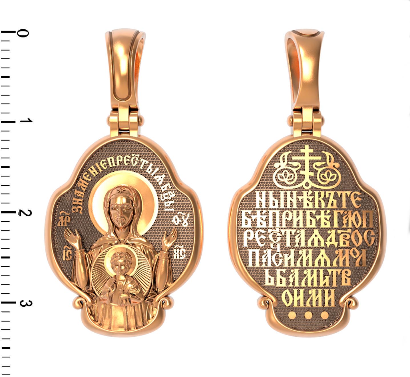 В центр образка помещен образ Божией Матери «Знамение», прославившийся многими чудесами в Новгороде в XII веке. Икона эта чтится как одна из самых великих святынь Русской земли. Молитвенно воздетые руки Богородицы означают заступничество за людей пред Богом. Рядом с Ней, на фоне круглого щита, — благословляющий Божественный Младенец — Спас-Эммануил.