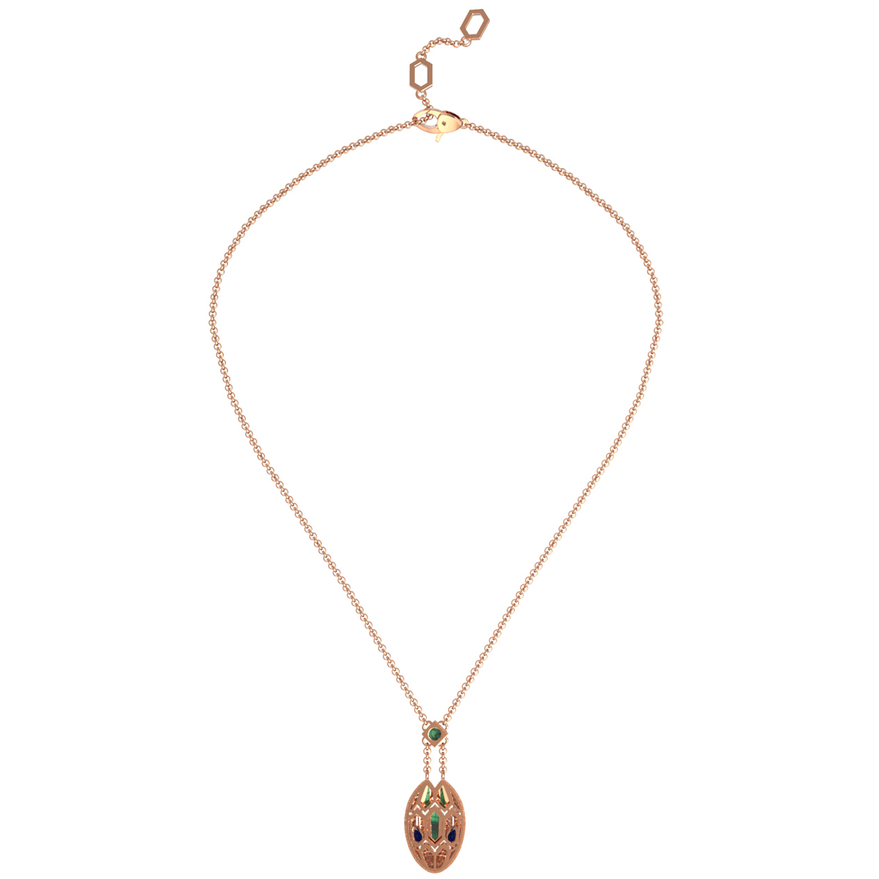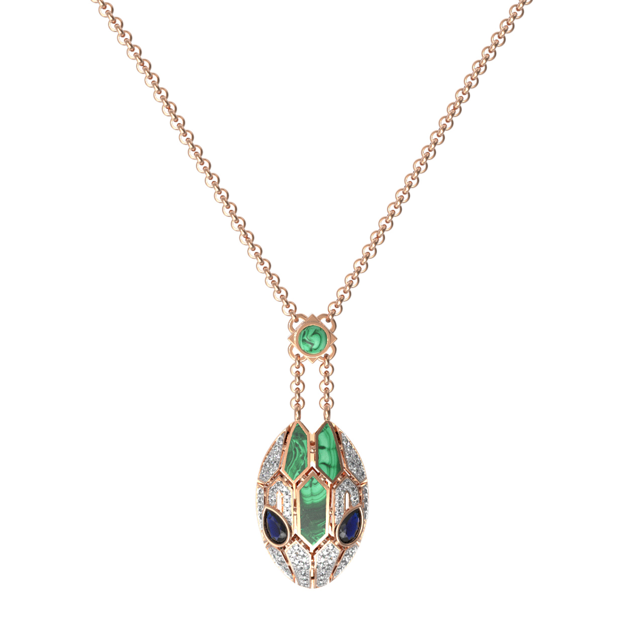 В центре композиции гармонично сочетаются три вида вставок: глубокий зеленый малахит, насыщенный синий сапфир и ослепительные белые бриллианты. Ювелиры использовали разнообразные формы огранки для создания уникальной игры света: камни имеют форму груши, круга и шестигранника. Всего в колье инкрустированы 82 драгоценных и полудрагоценных вставки, создающие сложный и детализированный узор.