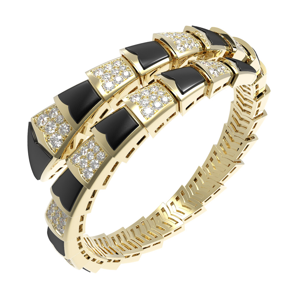 Центральным элементом композиции выступает гармоничный тандем камней: величественный черный оникс и сверкающие белые бриллианты. В изделии использовано 432 вставки круглой формы, которые создают завораживающую игру света при каждом движении. Точная геометрическая огранка бриллиантов усиливает их природное сияние, в то время как гладкие пластины оникса придают украшению строгость и особую глубину. Такой контраст материалов делает этот браслет универсальным аксессуаром: он подойдет как женщинам, так и мужчинам, стремящимся подчеркнуть свою индивидуальность.