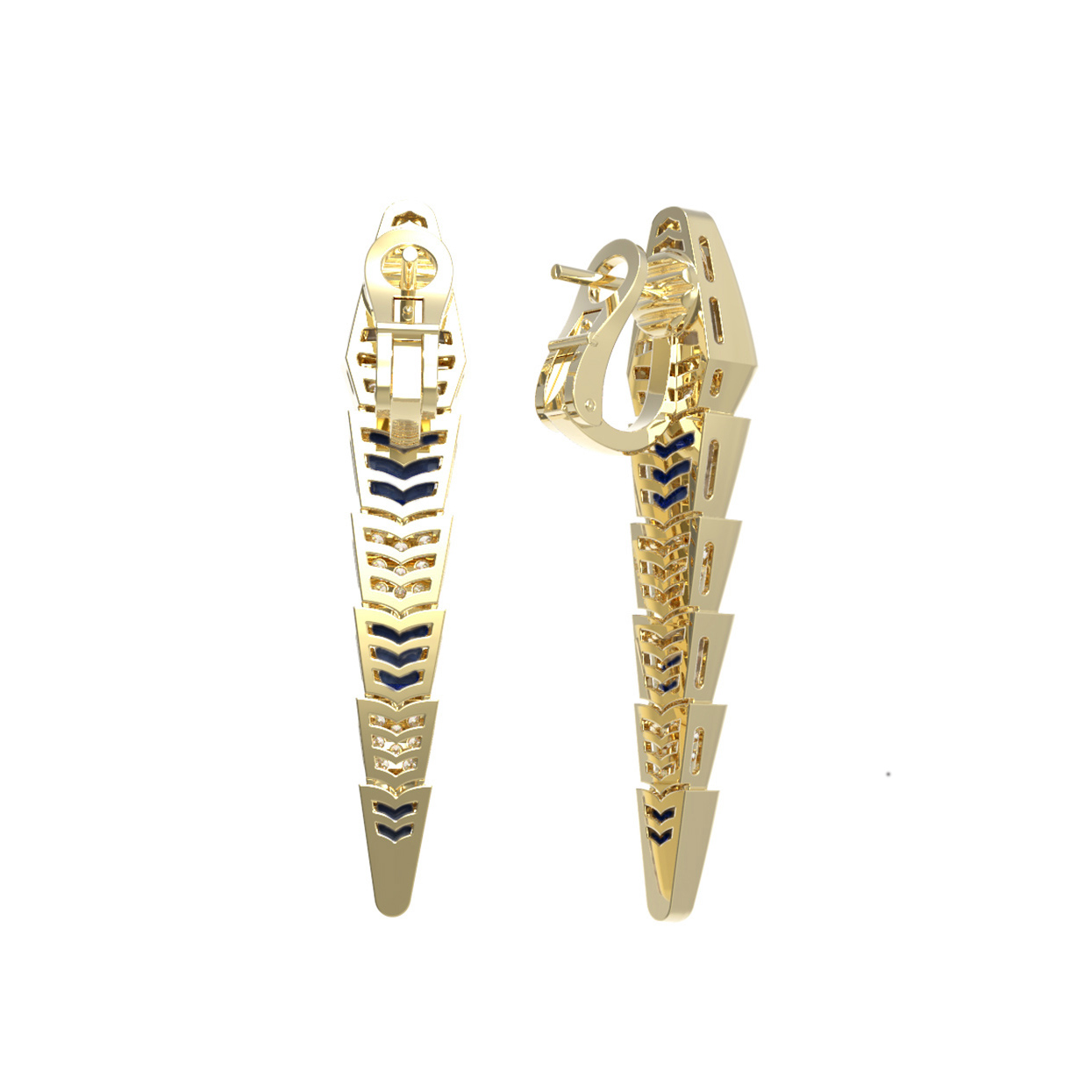 Эффектные серьги из коллекции De Luxe — Серпенти станут ярким акцентом вашего образа, подчеркивая безупречный вкус и статус. Украшение выполнено из благородного лимонного золота 585 пробы, чей теплый оттенок гармонично дополняет глубокий синий цвет натурального лазурита. Уникальный дизайн модели вдохновлен грацией и динамикой скорпионов, что отражено в изящной геометрической форме изделия.