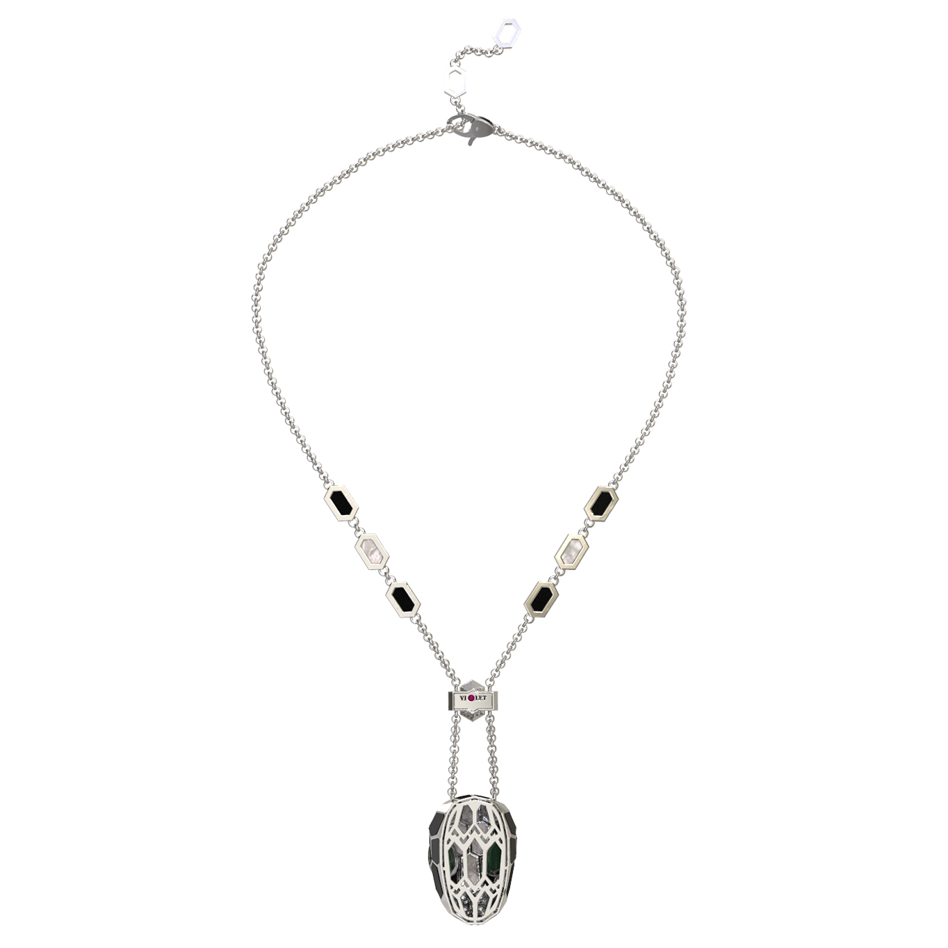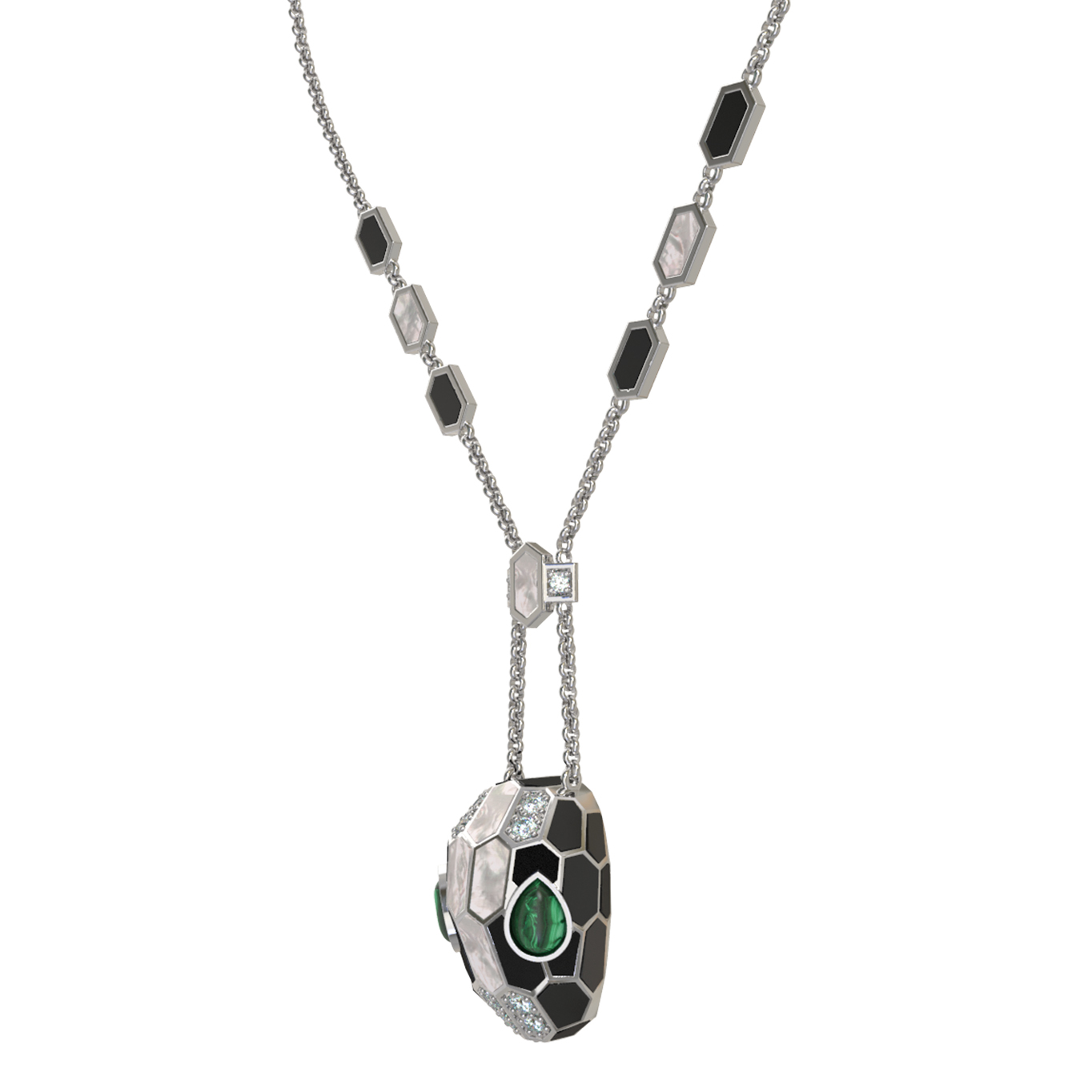 Колье из белого золота c бриллиантами, рубином, ониксом, малахитом и перламутром