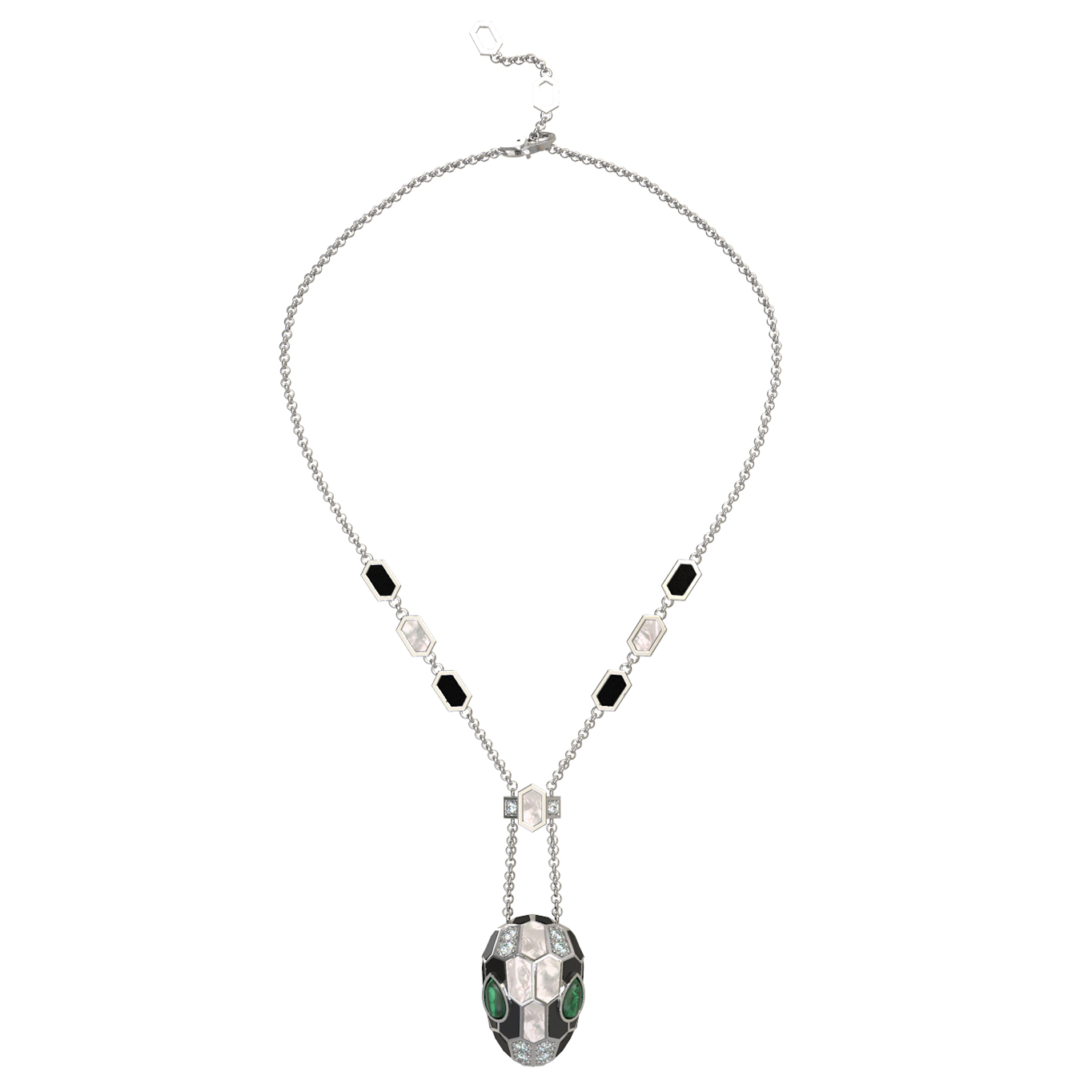 Эффектное колье из белого золота 585 пробы из коллекции De Luxe — Серпенти станет безупречным акцентом в вашем образе. Дизайн украшения, вдохновленный образом скорпиона, притягивает взгляд своей смелостью и утонченным сочетанием материалов. Ювелирная композиция объединила в себе 160 вставок: сверкающие бриллианты, благородный оникс, нежный перламутр, глубокий малахит и яркий рубин создают многогранную игру цвета и света. Контрастное сочетание белого, зелёного, красного, чёрного цветов и перламутра подчеркивает мастерство исполнения, а вставки формы груша и круг придают изделию особую выразительность.