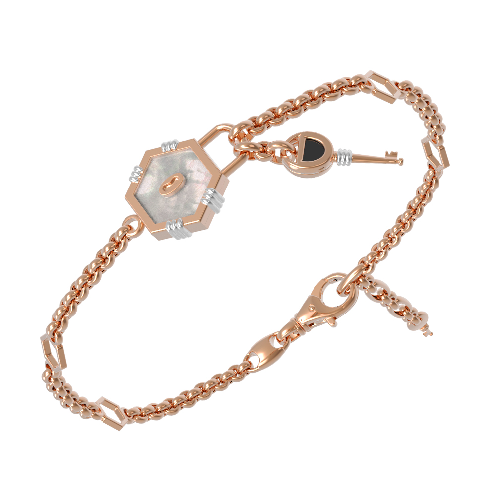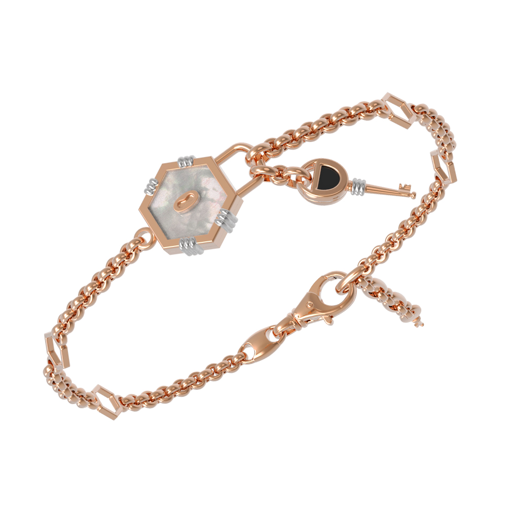 Контрастное сочетание вставок разной формы — полукруг и шестигранник — создает гармоничный визуальный акцент. Красное золото в сочетании с перламутром и ониксом смотрится выразительно и современно. Этот браслет одинаково хорошо подходит как для женщин, так и для мужчин, подчеркивая индивидуальность владельца. Уникальность дизайна позволяет носить его как самостоятельное украшение, так и в составе комплекта, дополняя образ другими изделиями из этой же серии.