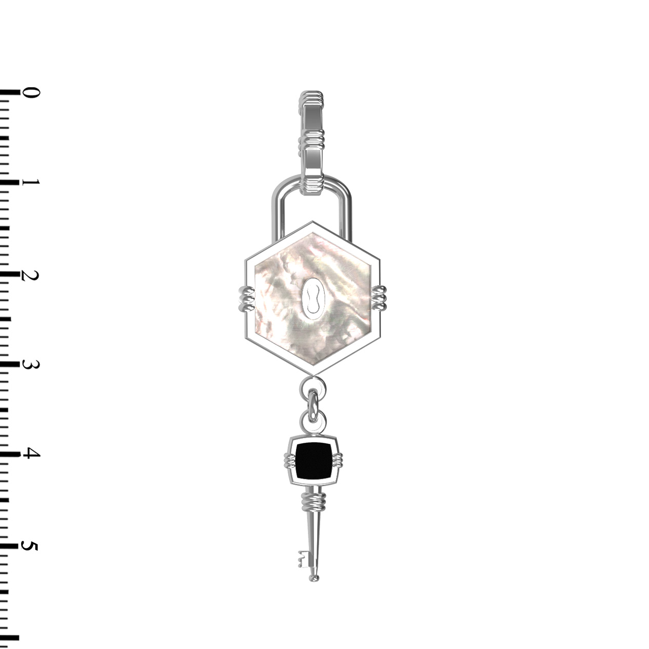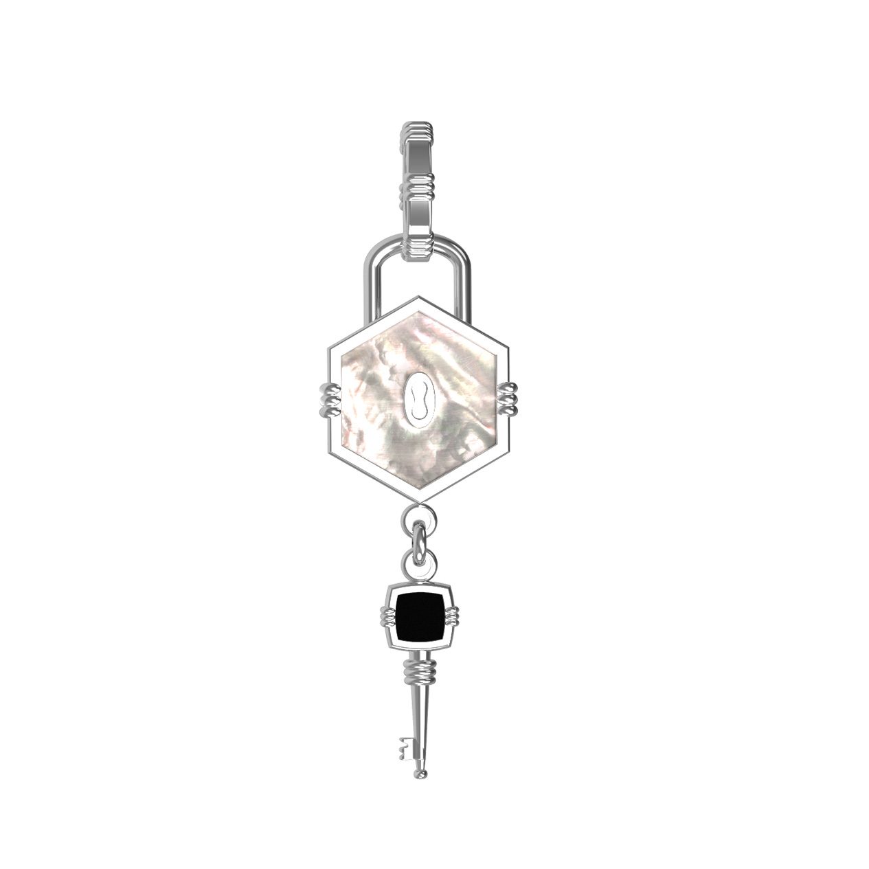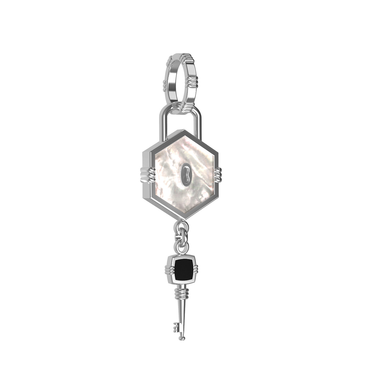 Центральным элементом композиции является вставка в форме шестигранника, выполненная из переливающегося перламутра. Контраст светлого перламутра подчеркивает глубокий, насыщенный черный цвет оникса. В общей сложности в изделии использованы 2 вставки, которые придают украшению особый визуальный объем и благородное сияние. Белое золото создает холодный и чистый фон, идеально гармонирующий с натуральными камнями.