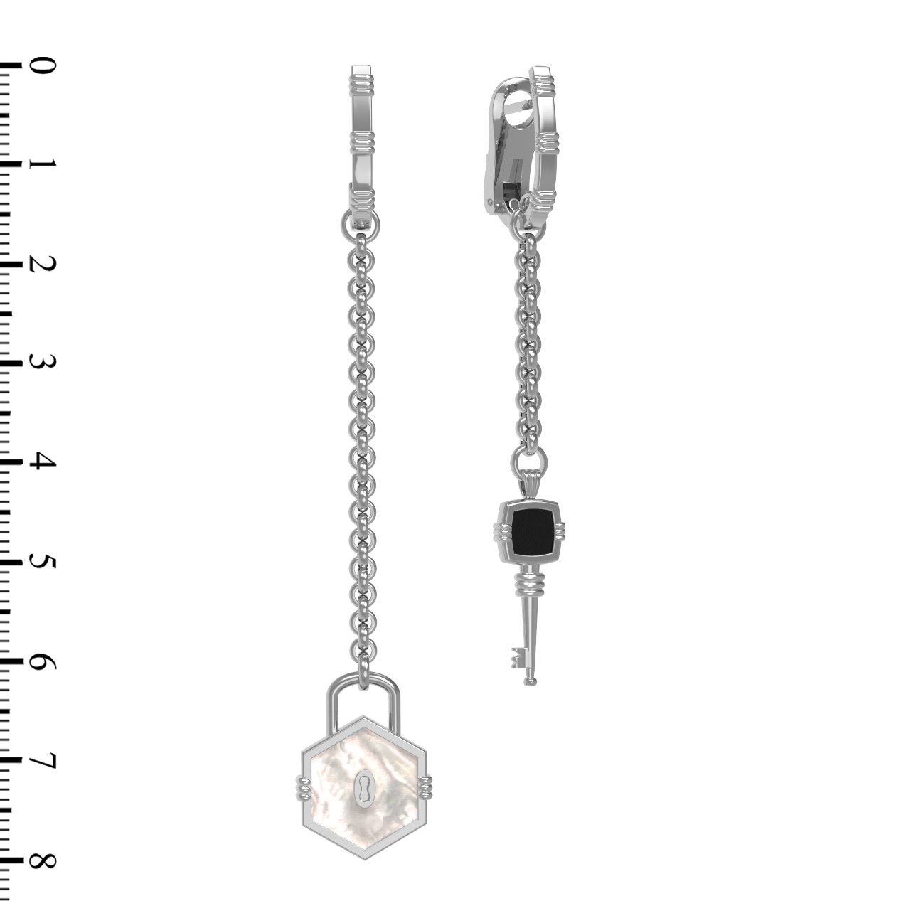 Особую утонченность серьгам придают вставки в форме шестигранника: глубокий черный оникс и нежный переливчатый перламутр создают изысканный контраст. Всего в изделии использовано 2 вставки, гармонично сочетающиеся с прохладным оттенком белого золота. Благодаря универсальному дизайну эти серьги подходят как для женщин, так и для мужчин, позволяя создавать уникальные стилистические решения.