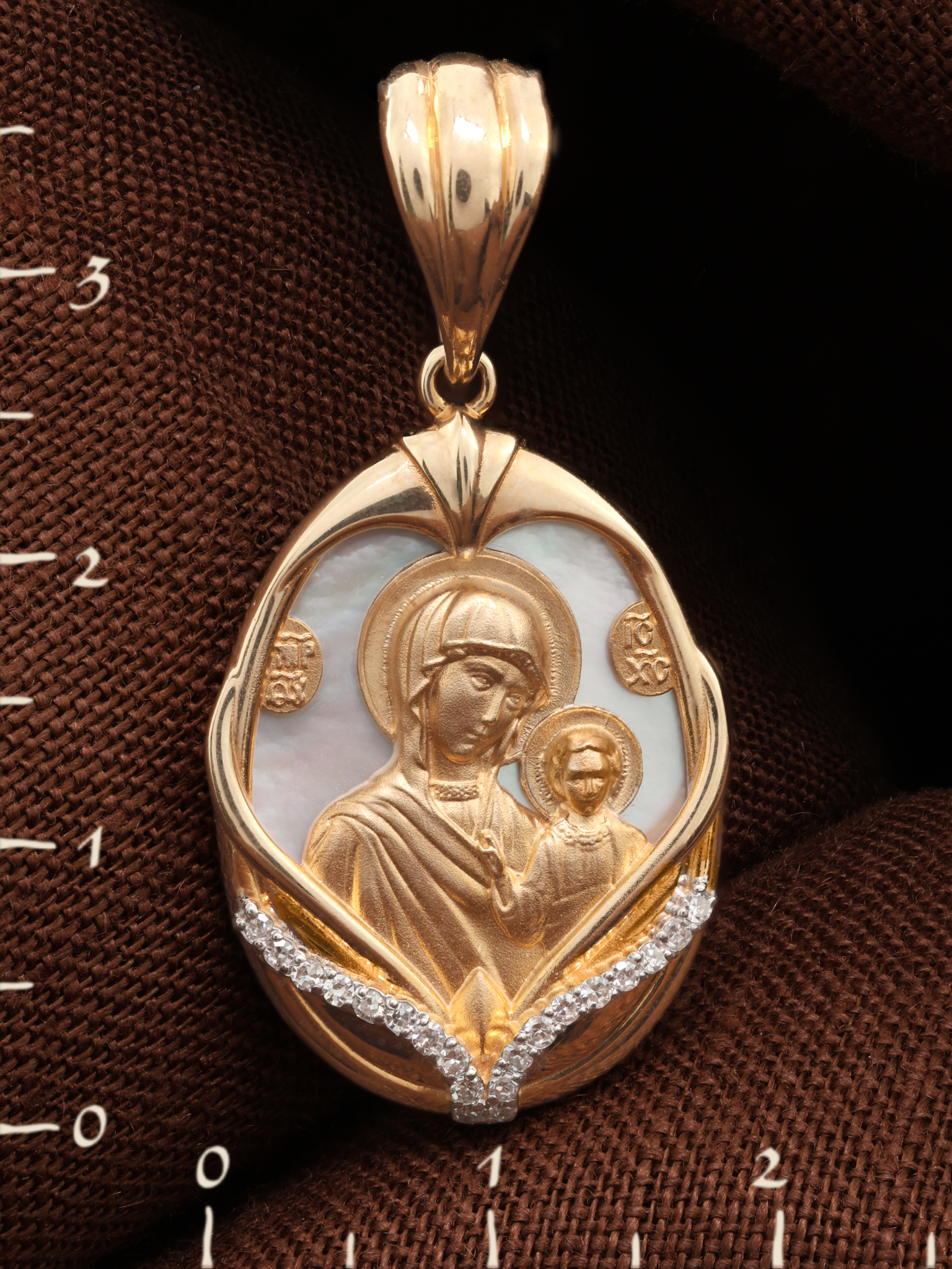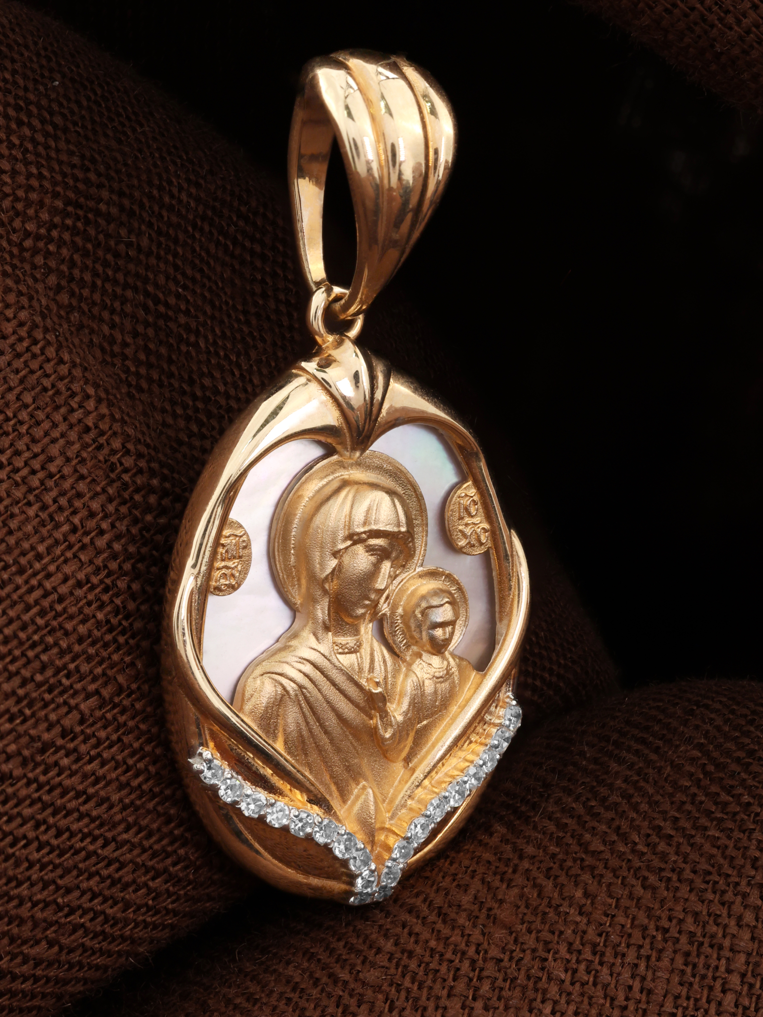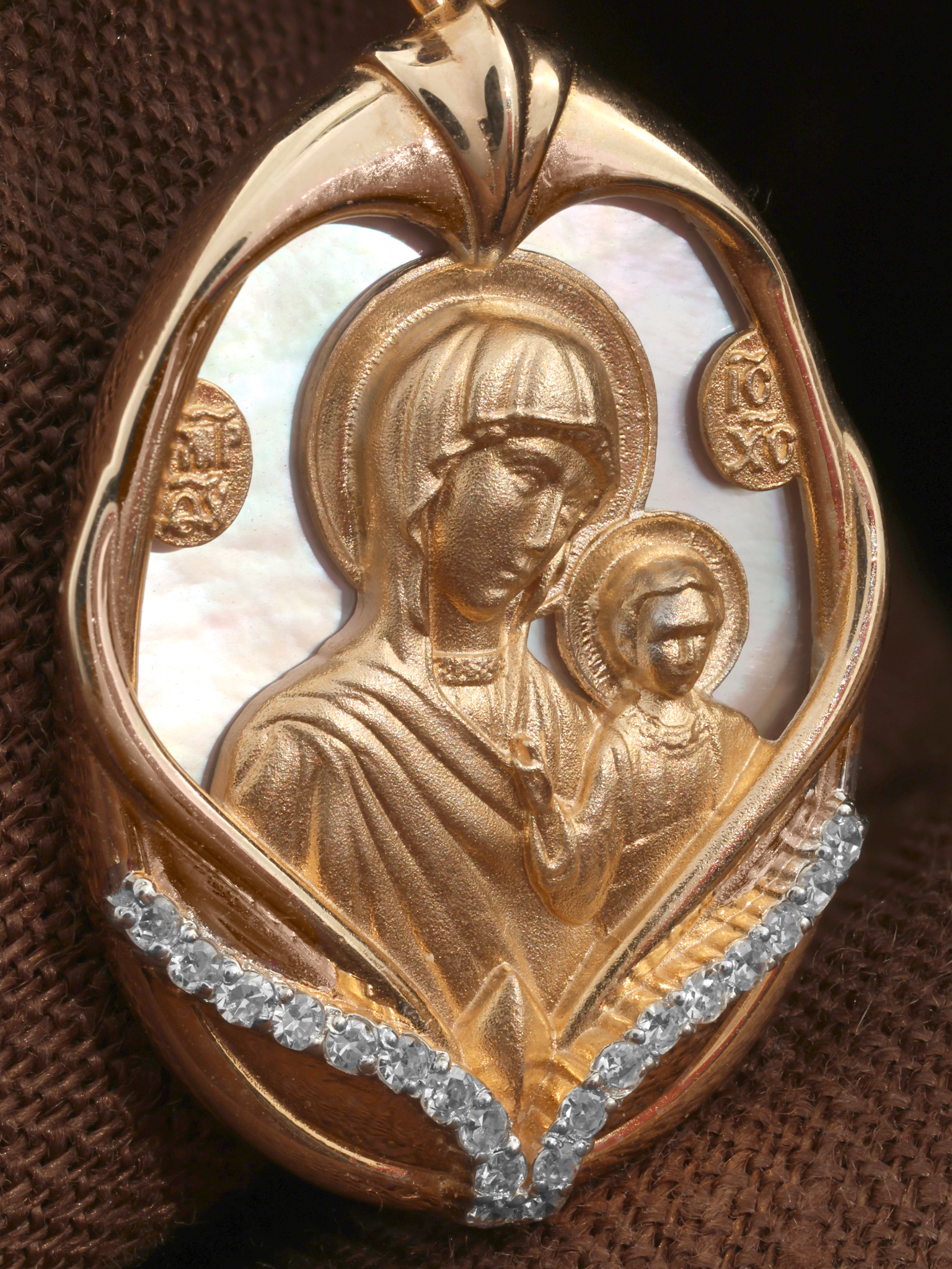 Нательная икона из красного золота 585 пробы c бриллиантами и перламутром