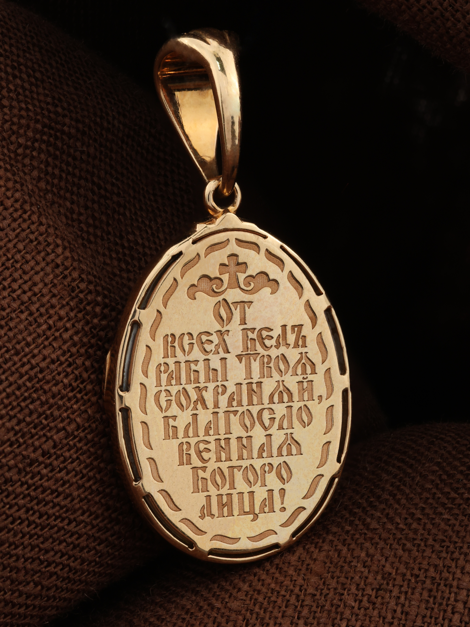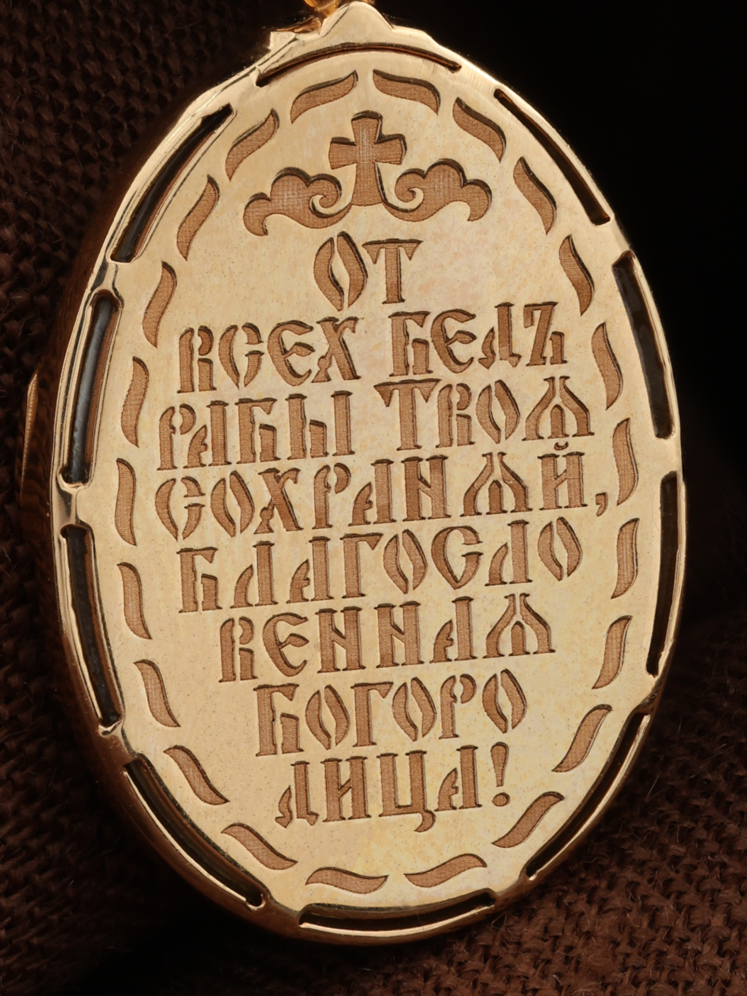 На оборотной стороне образка написана молитва: «От всех бед рабы Твоя сохраняй, Благословенная Богородица!»