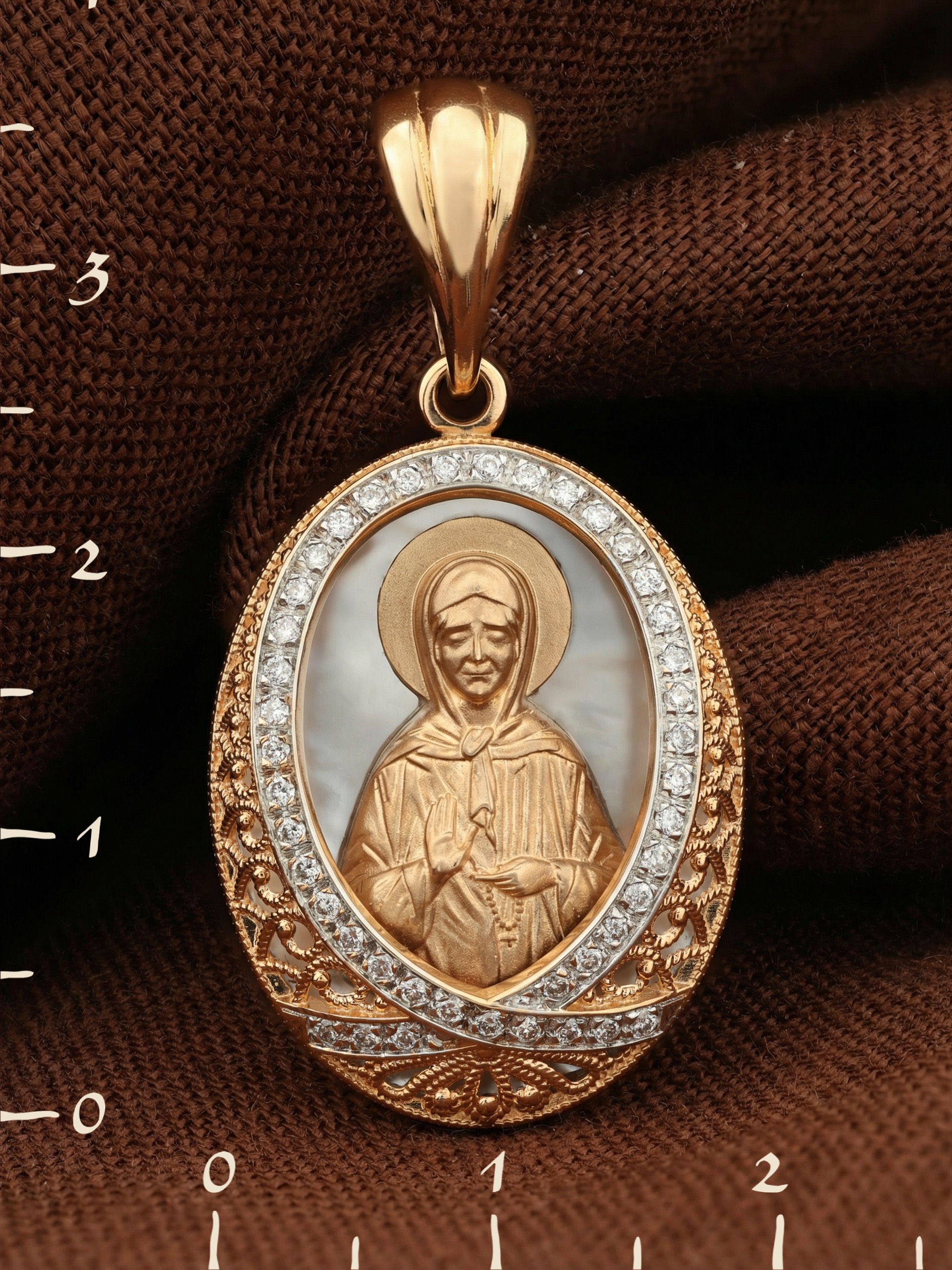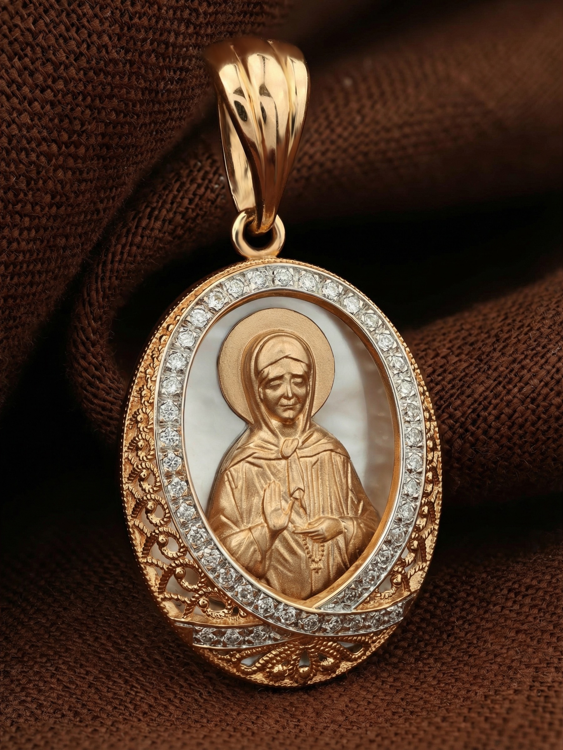 Нательная икона из красного золота 585 пробы c бриллиантами и перламутром