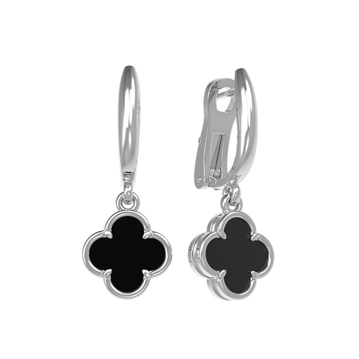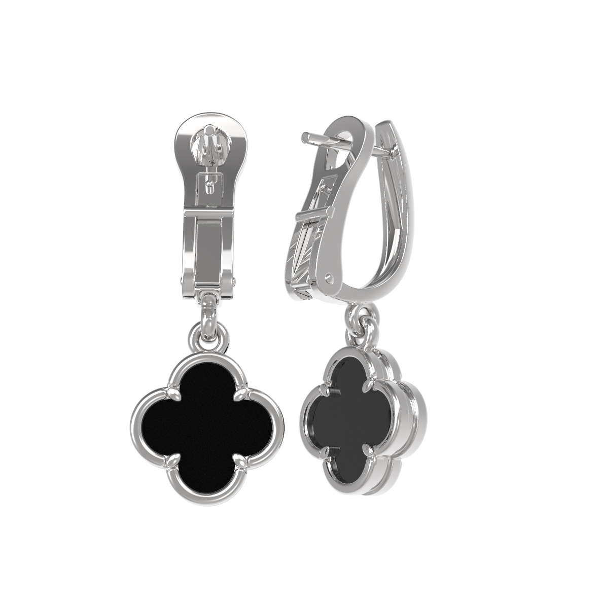 В центре композиции расположены две вставки из оникса насыщенного черного цвета. Контрастное сочетание сияющего металла и черного камня создает выразительный визуальный эффект, делая серьги заметным аксессуаром, который притягивает взгляды. Лаконичная форма и выверенные пропорции позволяют использовать эти серьги как для повседневного ношения, так и для торжественных выходов.