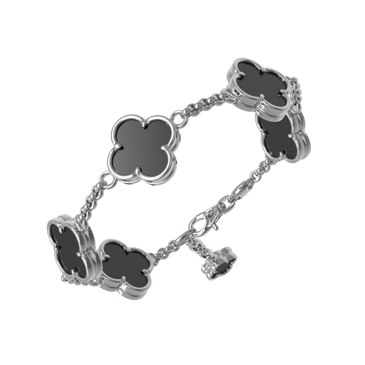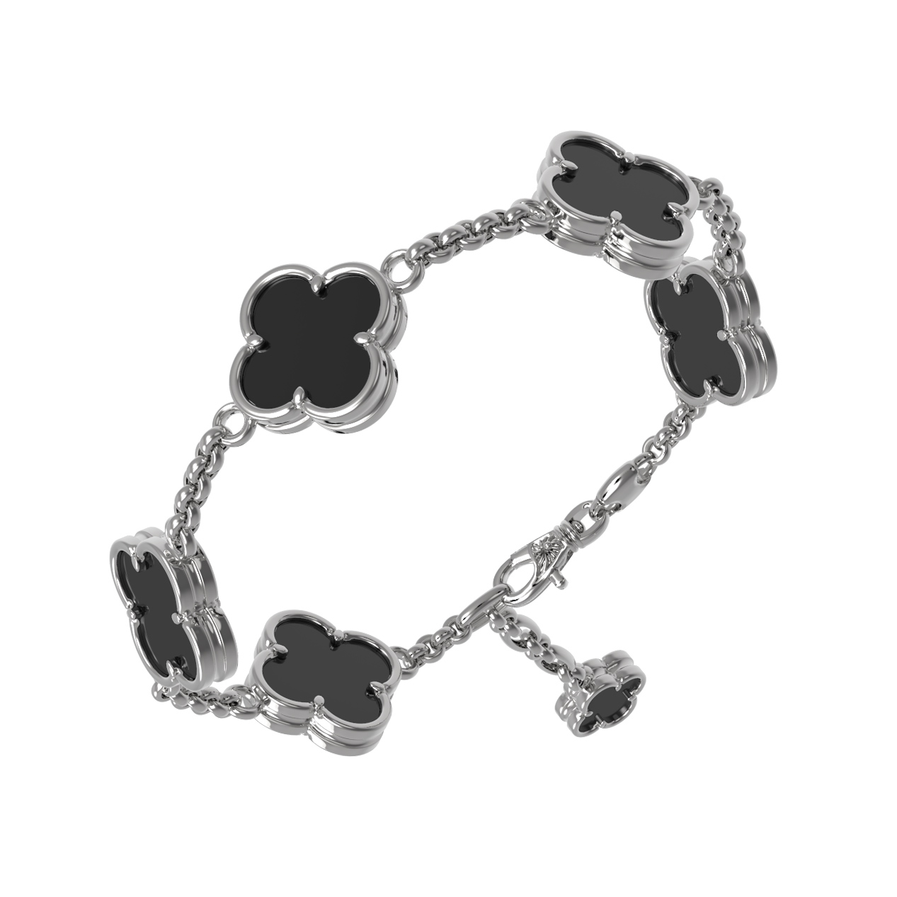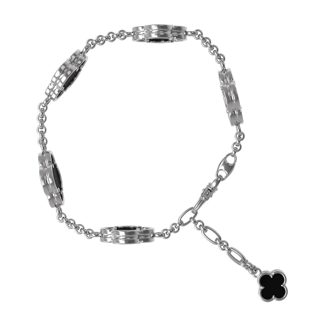 Элегантный браслет из белого золота 585 пробы — это сочетание утонченного стиля и глубокой символики. Модель выполнена в узнаваемом дизайне «Клевер», который давно стал классикой ювелирного искусства. В основе украшения лежит холодный блеск благородного металла, который идеально гармонирует с лаконичным черным цветом вставок.
