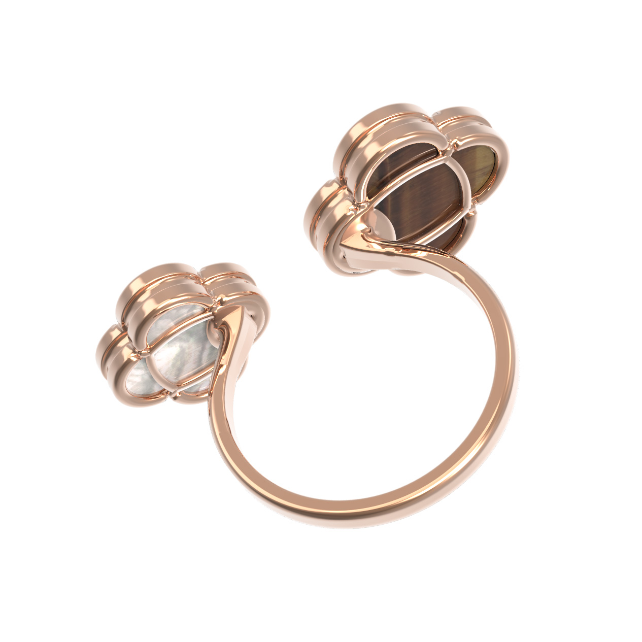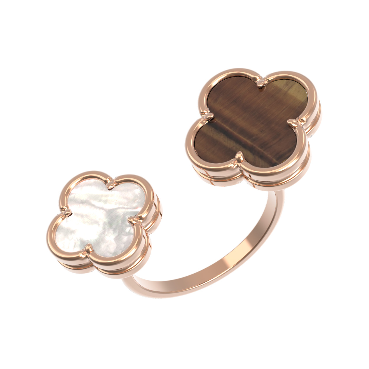 Кольцо из красного золота 585 пробы из коллекции De Luxe — Клевер весна — это утонченное ювелирное украшение, которое станет ярким акцентом вашего образа. Дизайн изделия вдохновлен природной символикой: изящные вставки в форме клевера придают аксессуару легкость и особое очарование. Контрастное сочетание материалов подчеркивает благородство металла: теплый оттенок красного золота гармонично дополнен глубоким оранжевым цветом тигрового глаза и нежным сиянием перламутра.