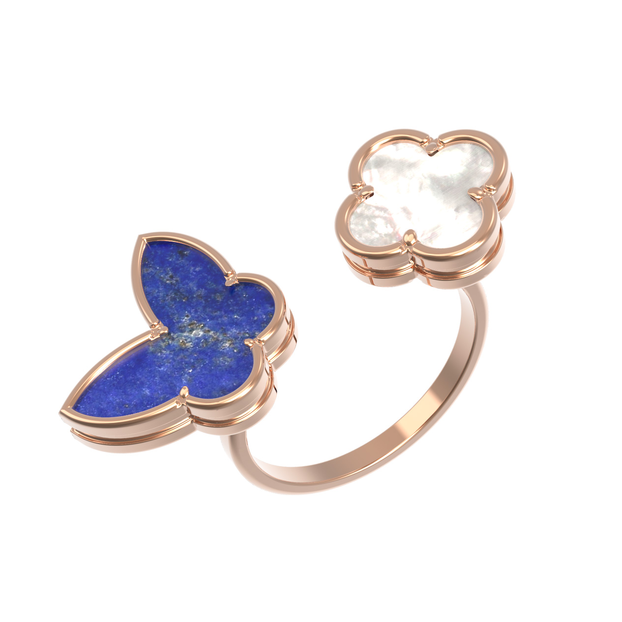 Композиция украшена двумя контрастными элементами: насыщенным синим лазуритом и нежным переливчатым перламутром. Сочетание этих натуральных камней создает гармоничный визуальный дуэт, который привлекает внимание своей глубиной и сиянием. Утонченные линии золотой оправы мягко обрамляют вставки, подчеркивая их природную красоту и статусность.