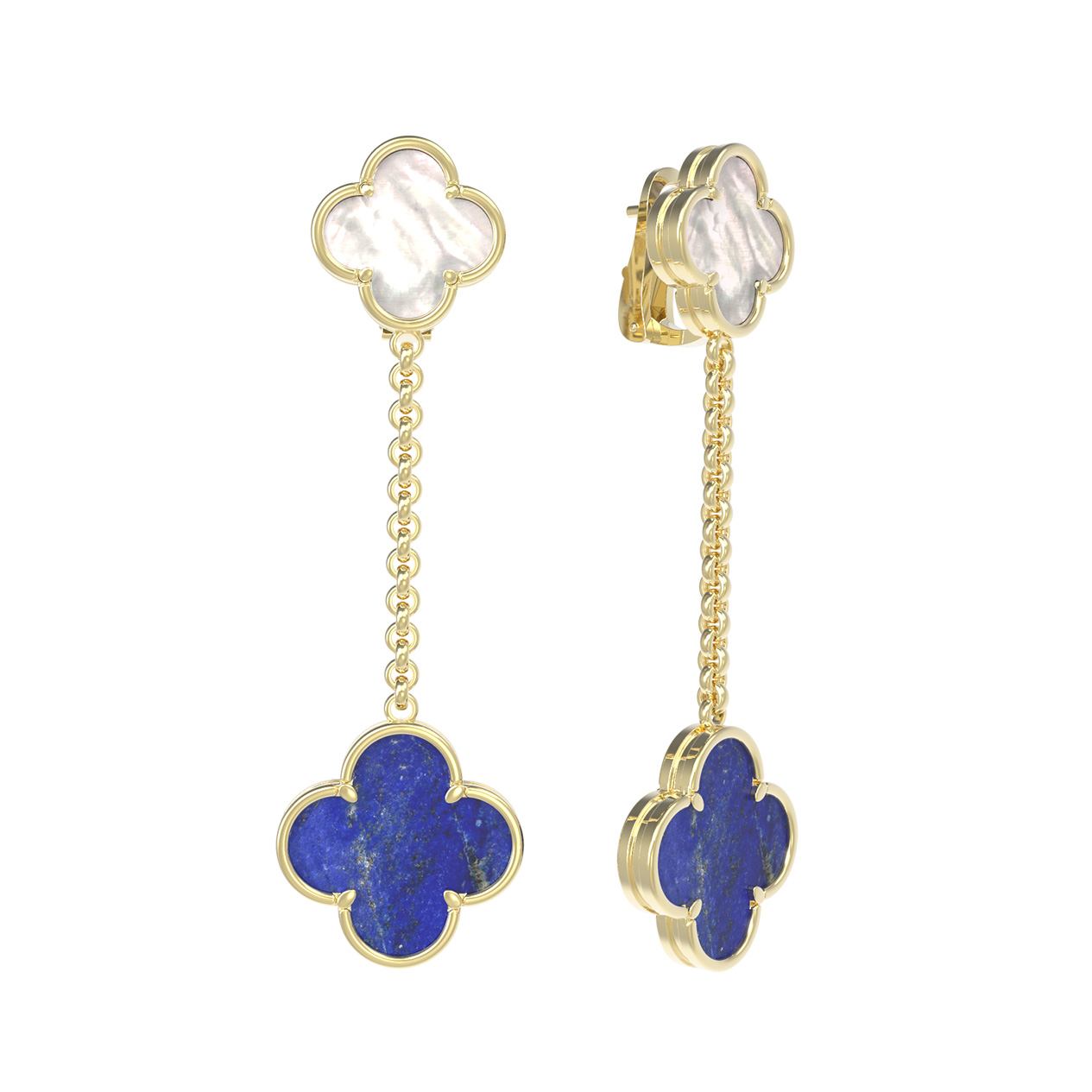 Серьги выполнены с вниманием к деталям: изящная цепочка соединяет верхний элемент с инкрустацией из перламутра и нижний подвесной элемент с лазуритом. Общее количество вставок составляет 2. Благодаря универсальной эстетике и выверенным линиям, эти серьги подходят для женщин и мужчин, которые ценят стиль и лаконичность. Дизайн в форме клевера символизирует удачу и природную красоту, воплощенную в ювелирном искусстве. Данное изделие прекрасно дополнит вечерний или повседневный наряд, а также может стать частью изысканного комплекта украшений. Привнесите ноту роскоши в свою коллекцию аксессуаров с этим оригинальным ювелирным творением из лимонного золота.