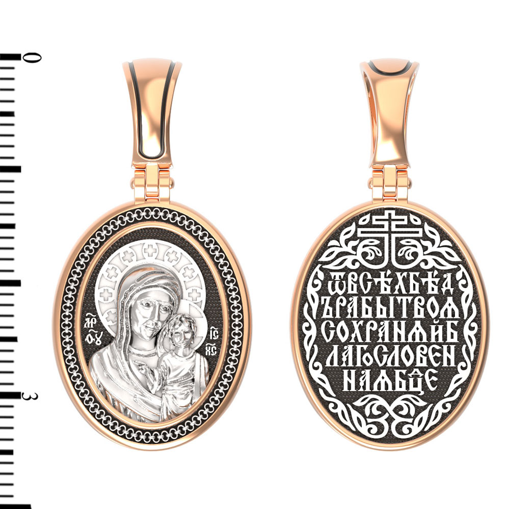На лицевой части образка изображена Казанская икона Божией Матери — одна из самых почитаемых в России чудотворных икон Богородицы. Богословское значение Казанской иконы — указать верующим истинный Путь к спасению, который лежит через Христа. Только Божия Матерь имеет настолько сильное дерзновение к Спасителю, что может ходатайствовать перед Ним за всех верных. Именно этот образ дарится новой повенчанной паре, как хранитель очага и семейная реликвия. Молитва перед Казанской иконой Божьей Матери помогает во всех сложных случаях жизни, в болезнях, во всех печалях, невзгодах, скорбях. Уникальная история появления, чудеса, случившиеся по молитвам православных людей возле образа — все это делает Казанскую Богородицу особенной, среди тысяч других икон.