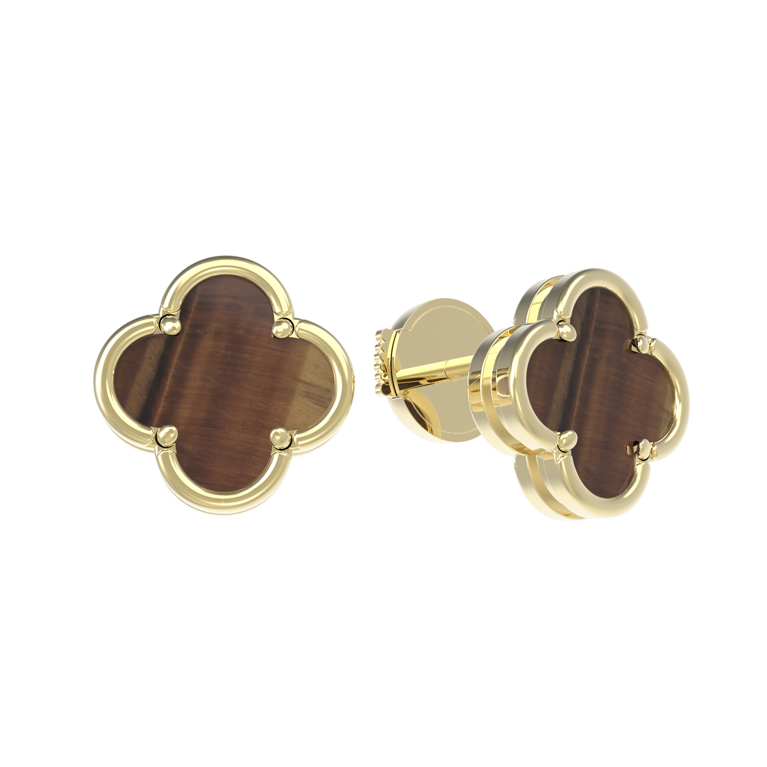 Центральным элементом композиции стали вставки из тигрового камня. Глубокий оранжевый оттенок минерала, обрамленный теплым сиянием лимонного золота, создает контрастное и выразительное сочетание. Каждая пара включает две вставки, которые подчеркивают естественную красоту камня. Тщательно проработанная форма и безупречная полировка металла обеспечивают комфорт при ношении и долговечность изделия.