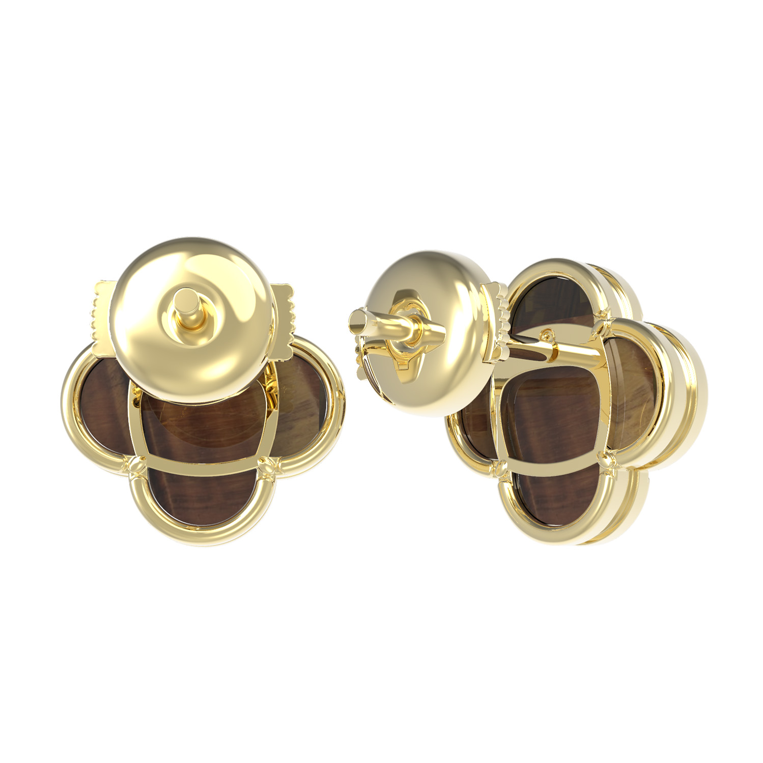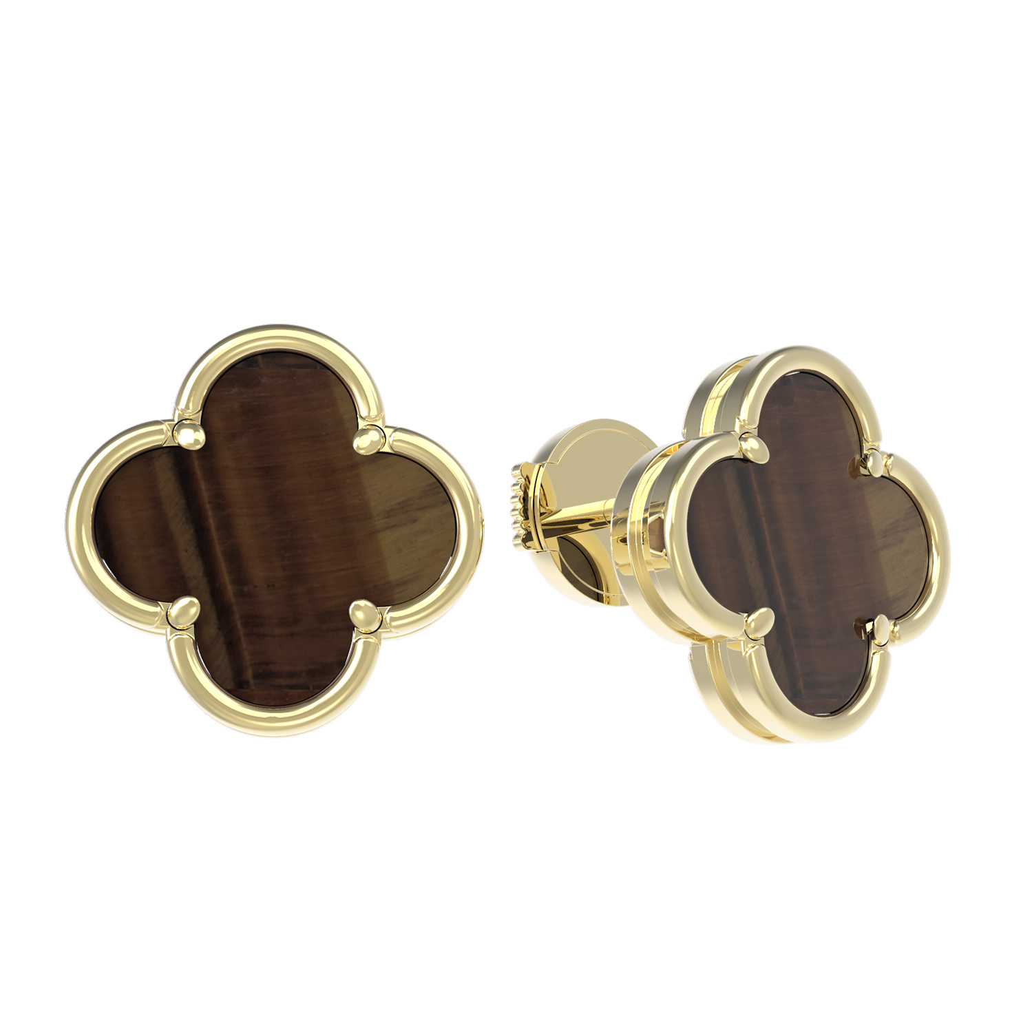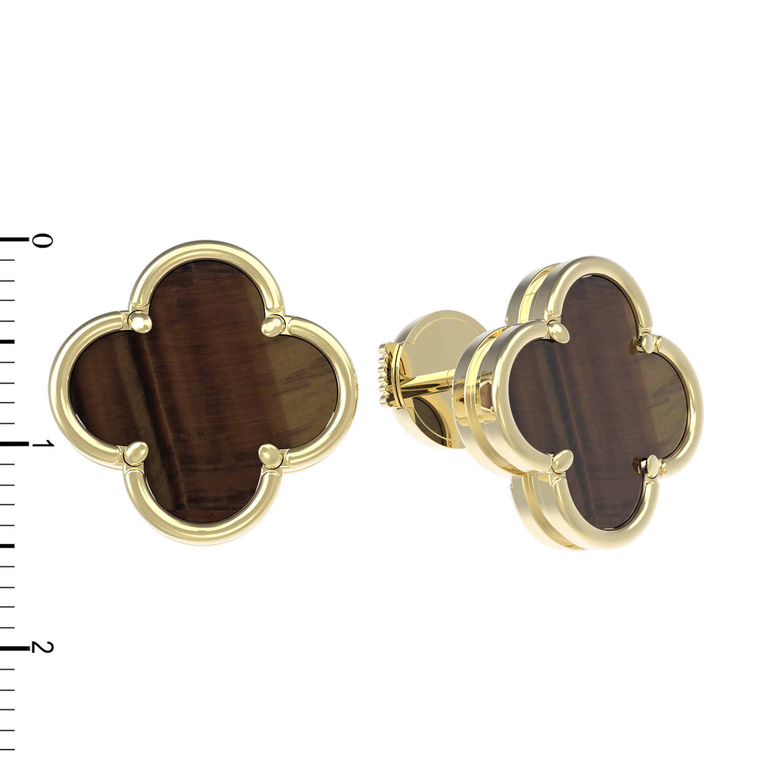 В центре композиции расположены две эффектные вставки из тигрового глаза. Уникальная текстура этого камня, имеющего насыщенный оранжевый оттенок с характерными переливами, придает серьгам особую глубину и выразительность. Лаконичная форма клевера в сочетании с теплым сиянием лимонного золота делает данные серьги универсальным аксессуаром.