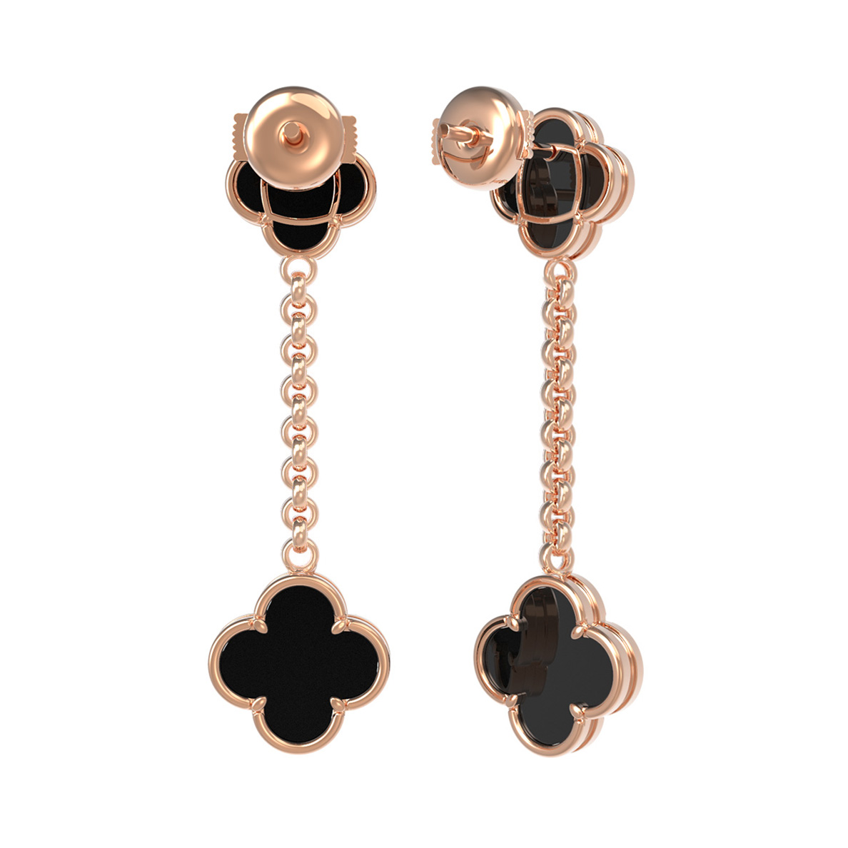 Элегантные и выразительные серьги из красного золота 585 пробы станут изысканным акцентом вашего образа. Дизайн украшения, выполненный в популярной стилистике Клевер, подчеркивает безупречный вкус владельца. Глубокий черный цвет вставок из оникса эффектно контрастирует с теплым блеском драгоценного металла, создавая гармоничное и статусное сочетание. В каждой паре серег предусмотрено 4 вставки из оникса, которые красиво играют при свете.
